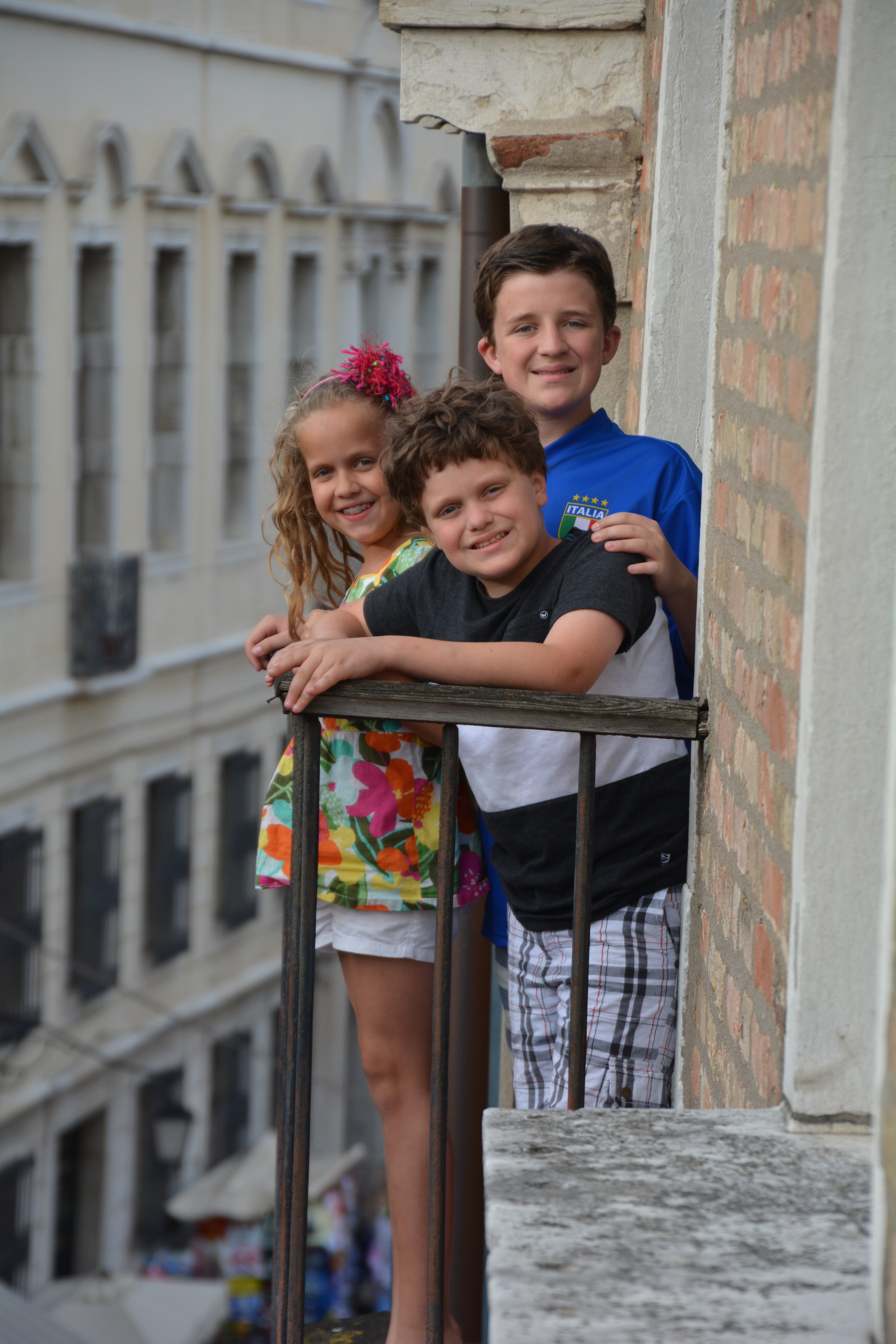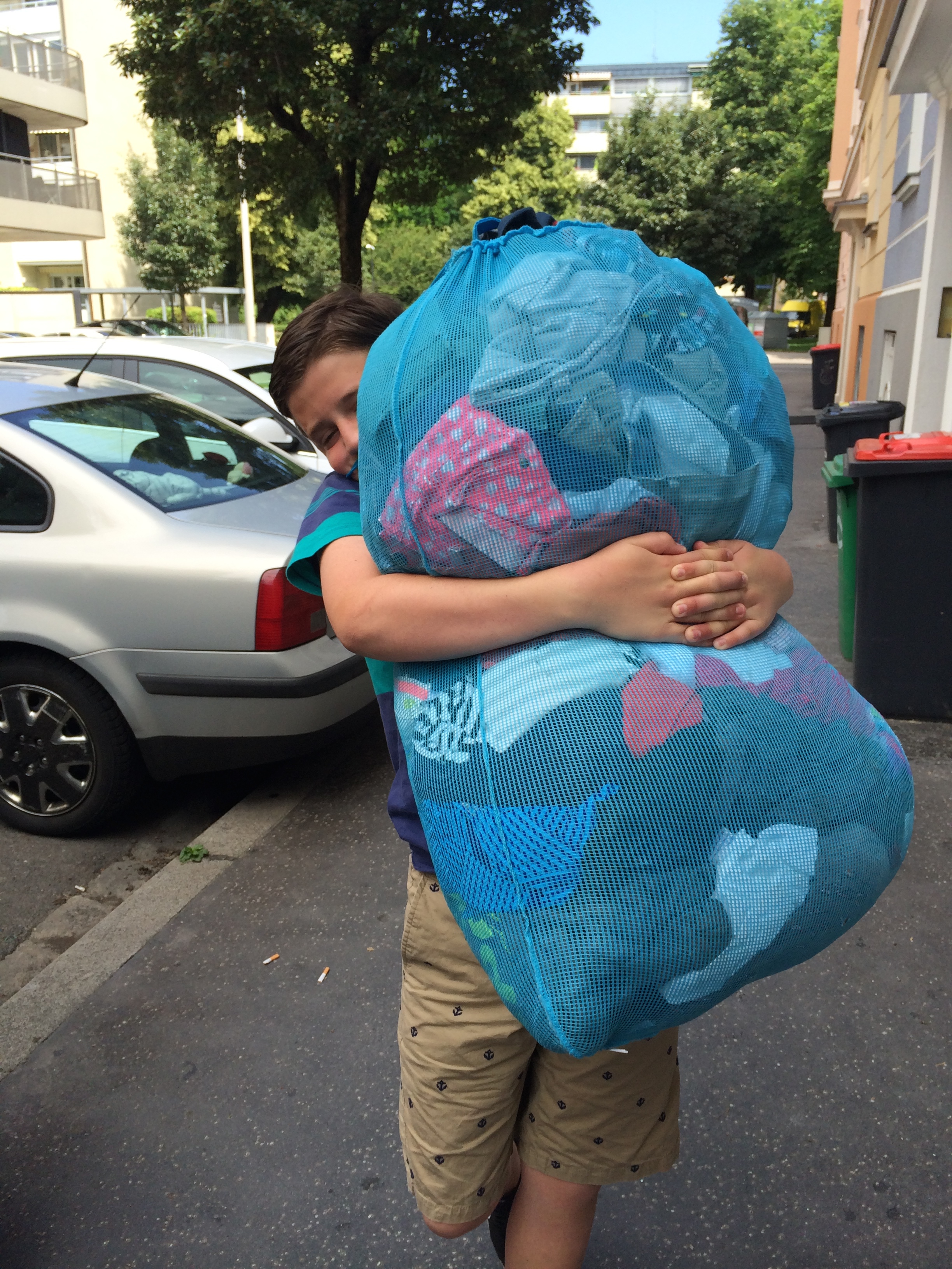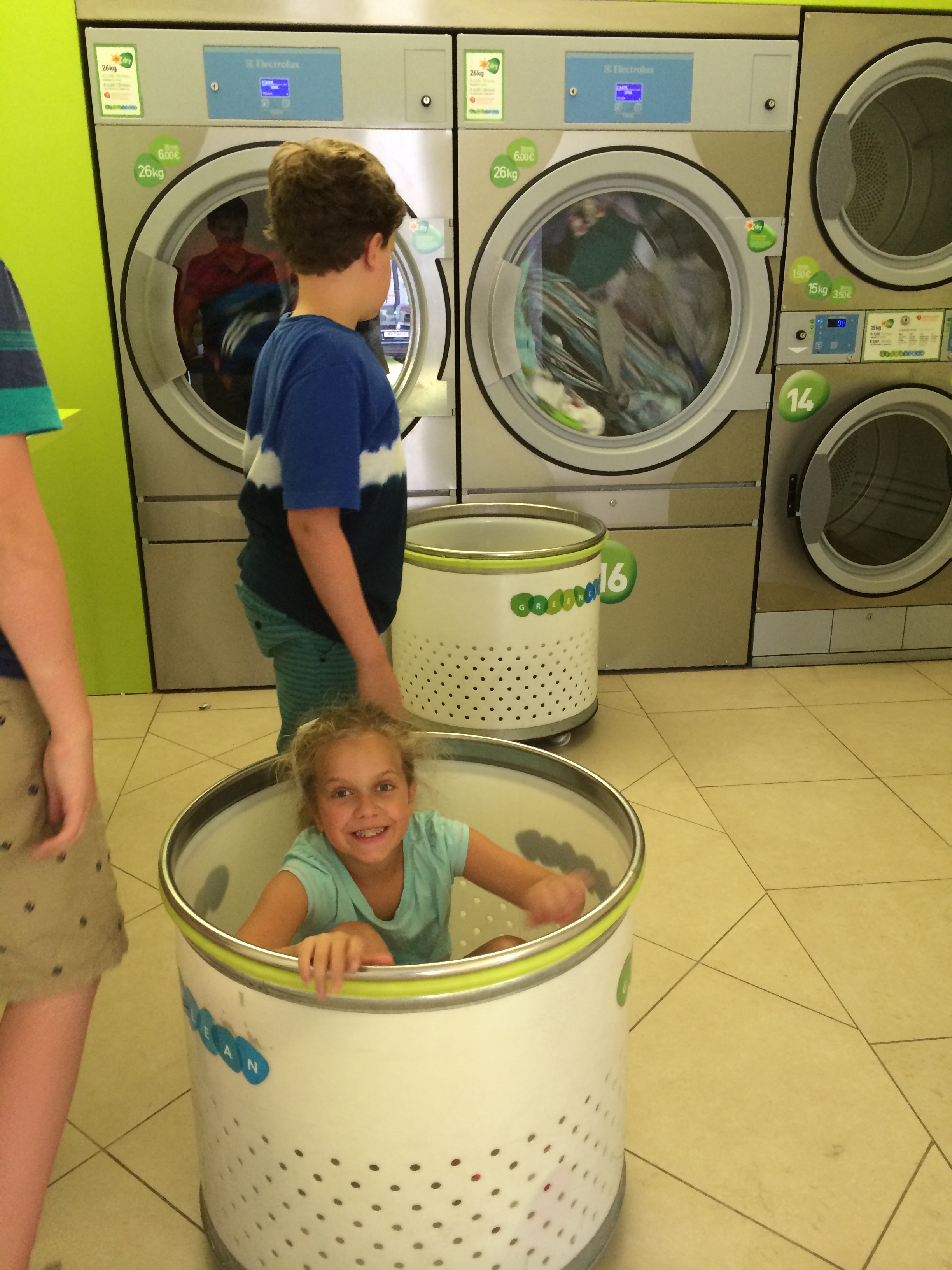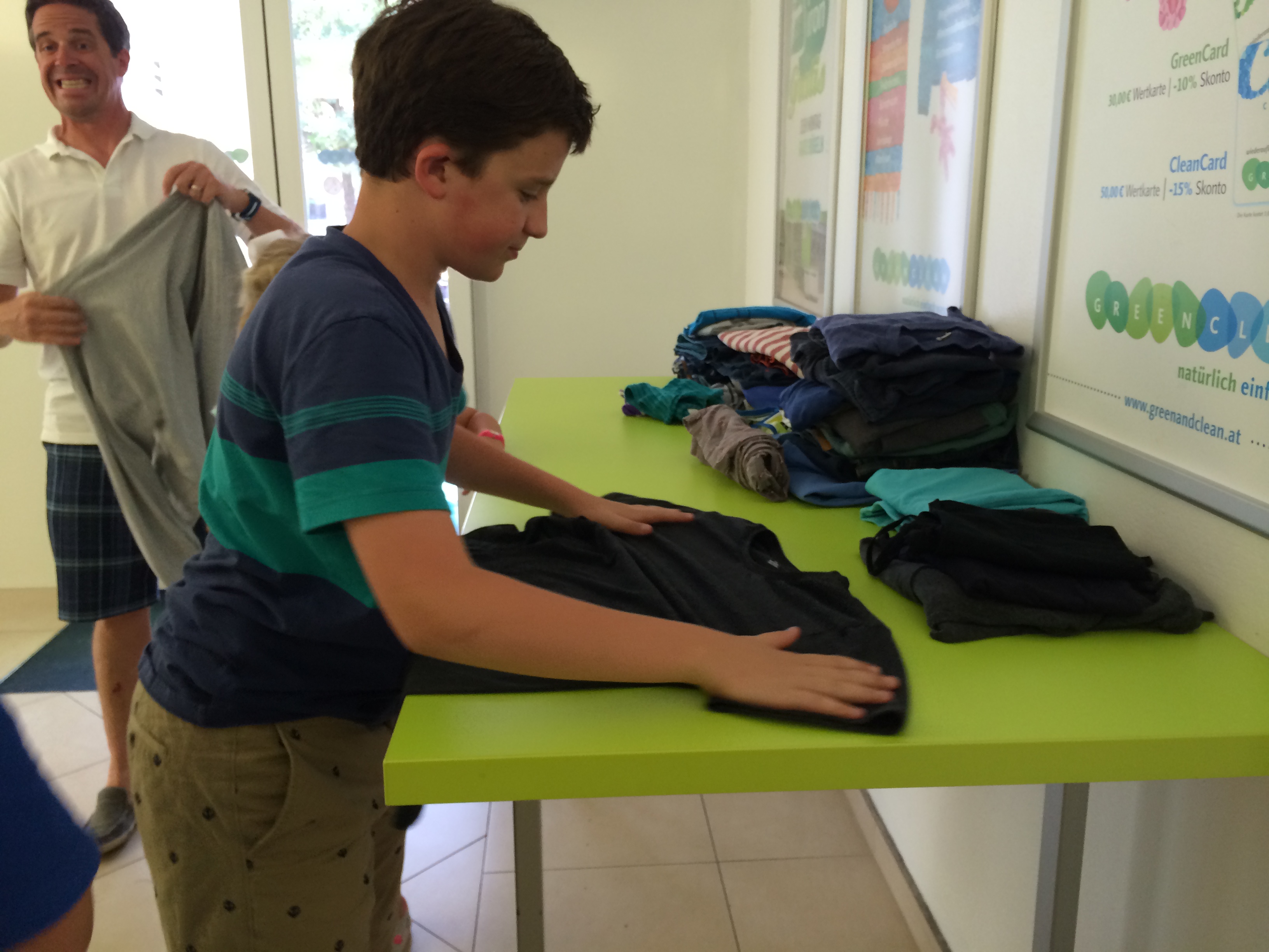 How wonderful to wake up looking out at the Austrian mountains! We wandered down to breakfast. Our first full day in Salzburg demanded a little housekeeping first – we had a MOUND of dirty laundry to work through. After breakfast we navigated our way down Moosstrasse to the “Green Clean” laundromat. Very cool but not cheap. We’d insisted the kids come along to help, and they quickly found a park down the street where they could play with Wilson and make each other dizzyingly sick on the old-school merry-go-throw-up. In the laundromat, we met the mother of a sweet family from the States who was in the middle of their OWN summer-long tour of Europe. Though they were CAMPING. In their 18-foot RV. Mom, Dad, and all TWELVE of their kids! Yikes! Now THAT’s togetherness.