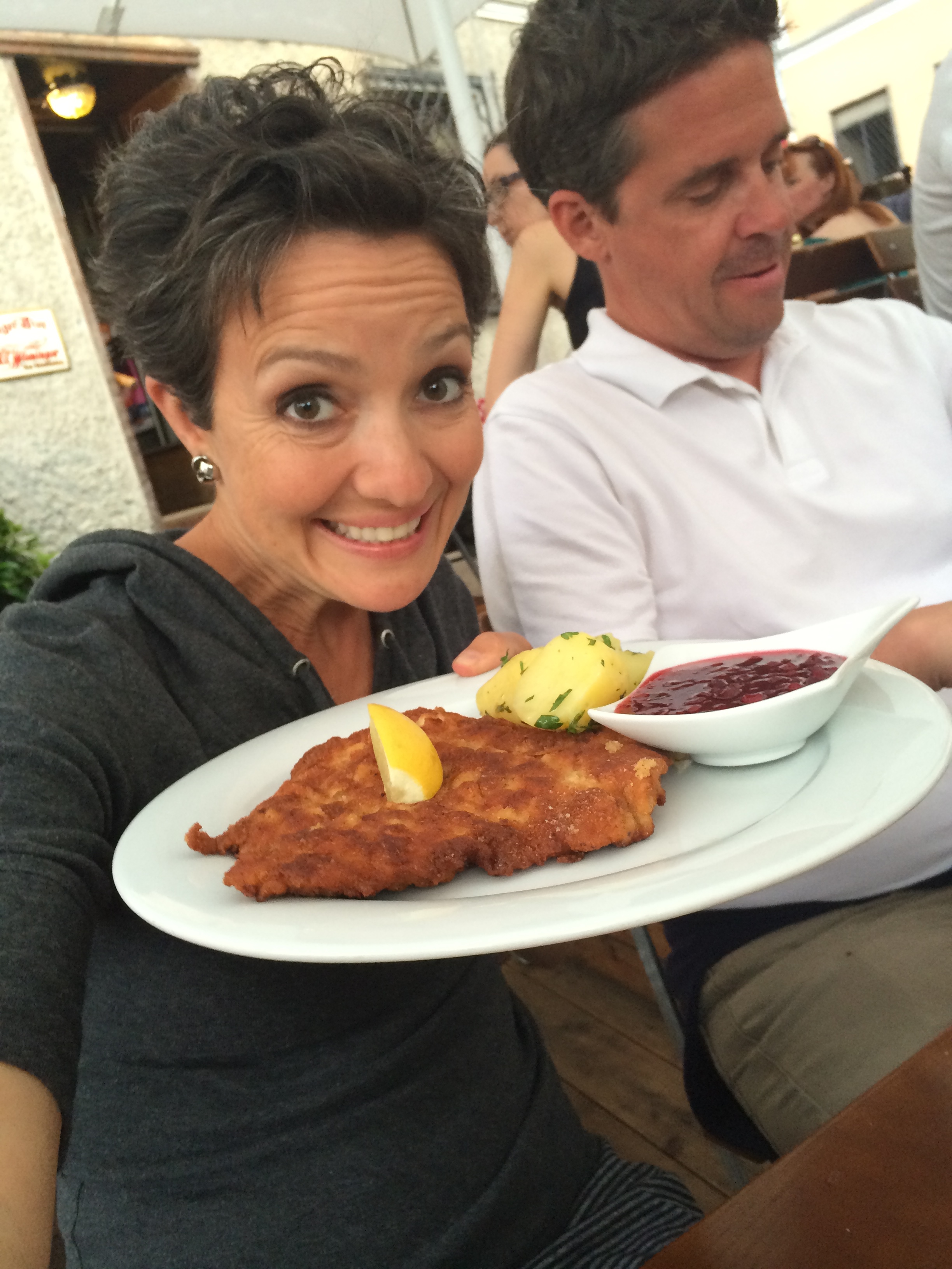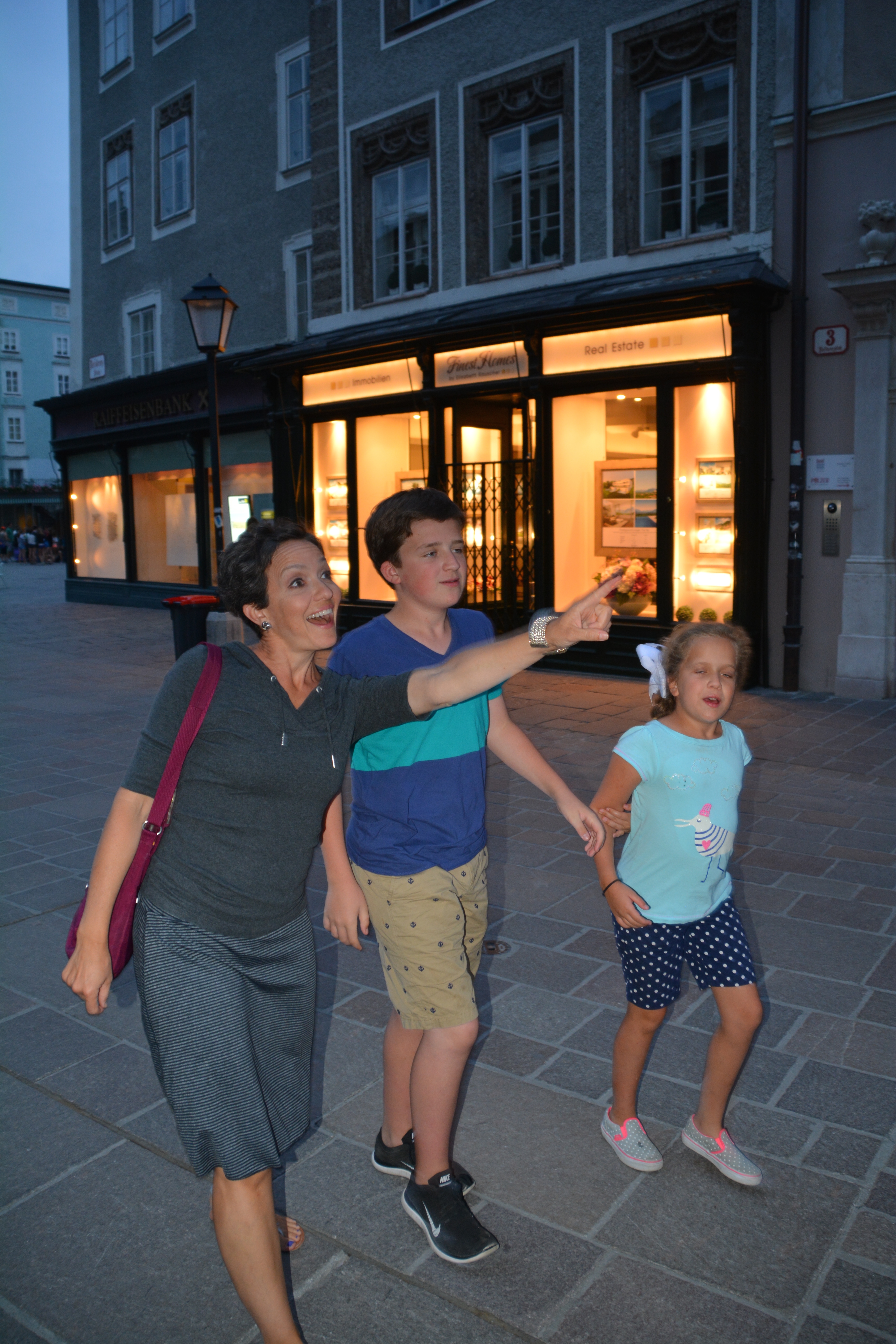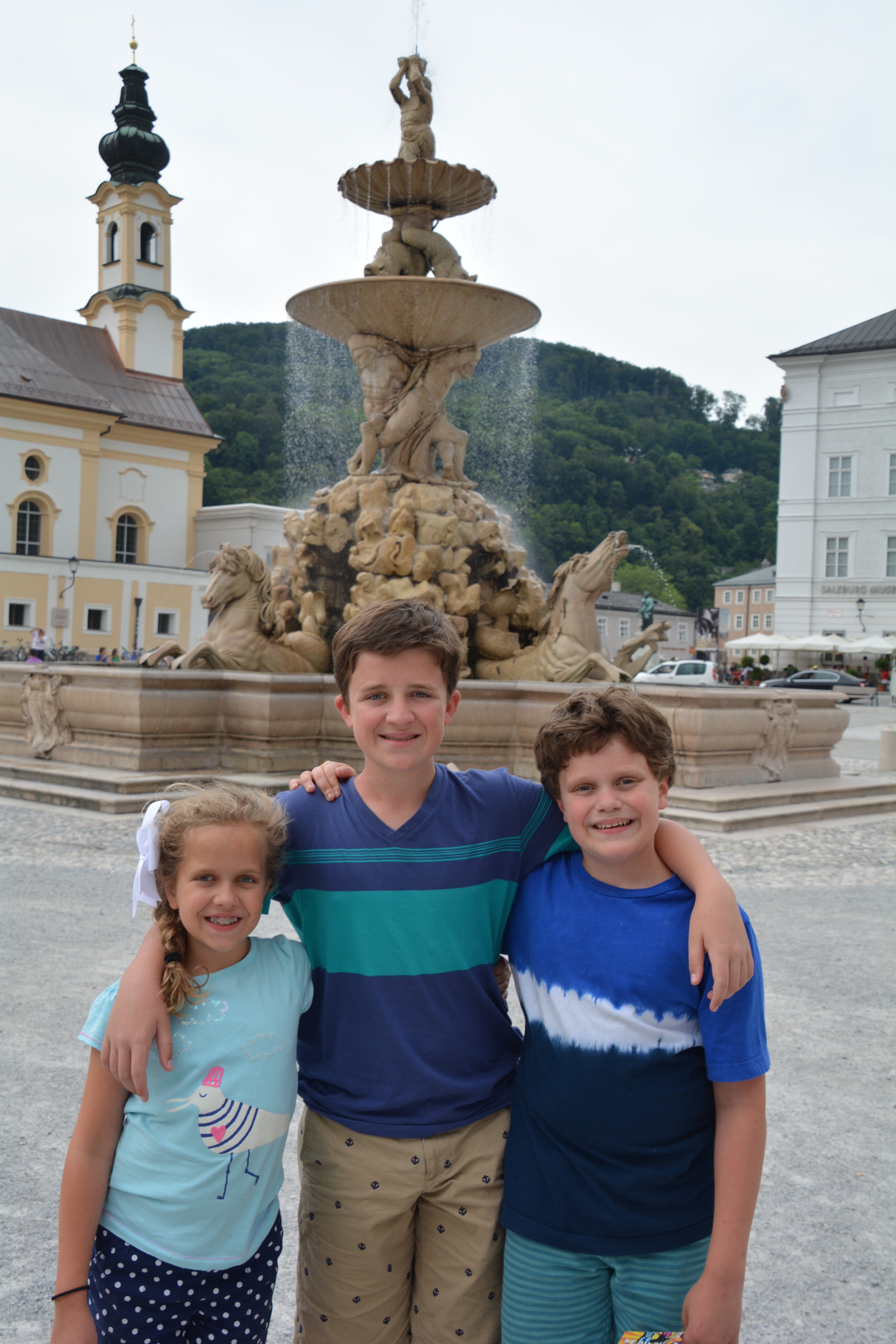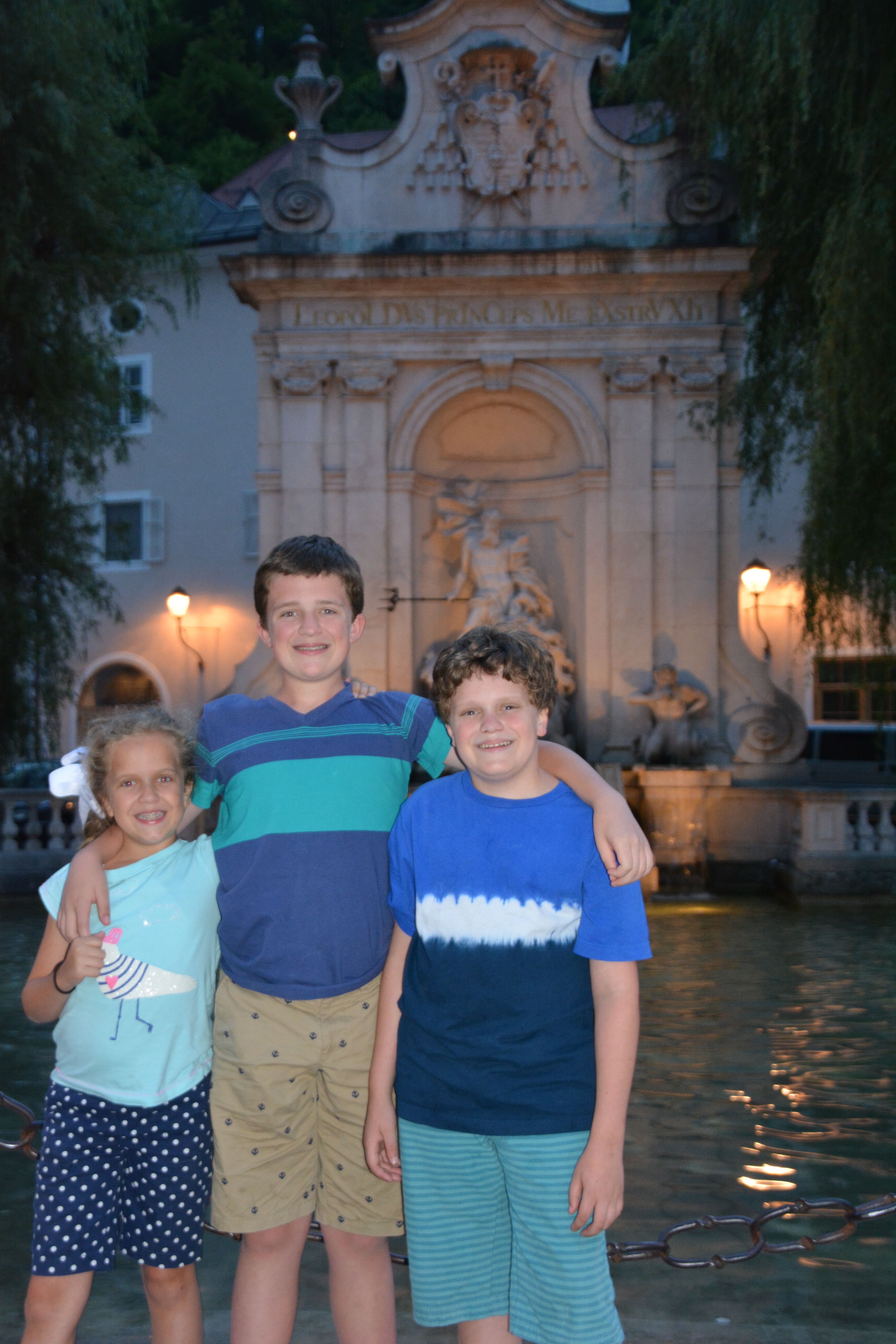 Into old-town Salzburg for a walk before dinner. We found a parking garage for the car and strolled through the narrow streets before ending up in the central “platz”, where we spotted our first Sound of Music landmark – the horse fountain shown in “I Have Confidence”. With photos and the requisite reenactment out of the way, we toddled past Mozart’s birthplace looking for a place for dinner. With a little luck, LouAnn and I found the exact same café we had loved so much 19 years earlier, and we all settled in for a wonderful Austrian dinner of schnitzel, pretzels, and beer. (well, ONE of us had all three) The kids tried fancy, local soft drinks that were served in WINE GLASSES, so they thought that was VERY grown-up. LouAnn and I grinned at each other all evening, soaking in the nostalgia of our 19-year return.