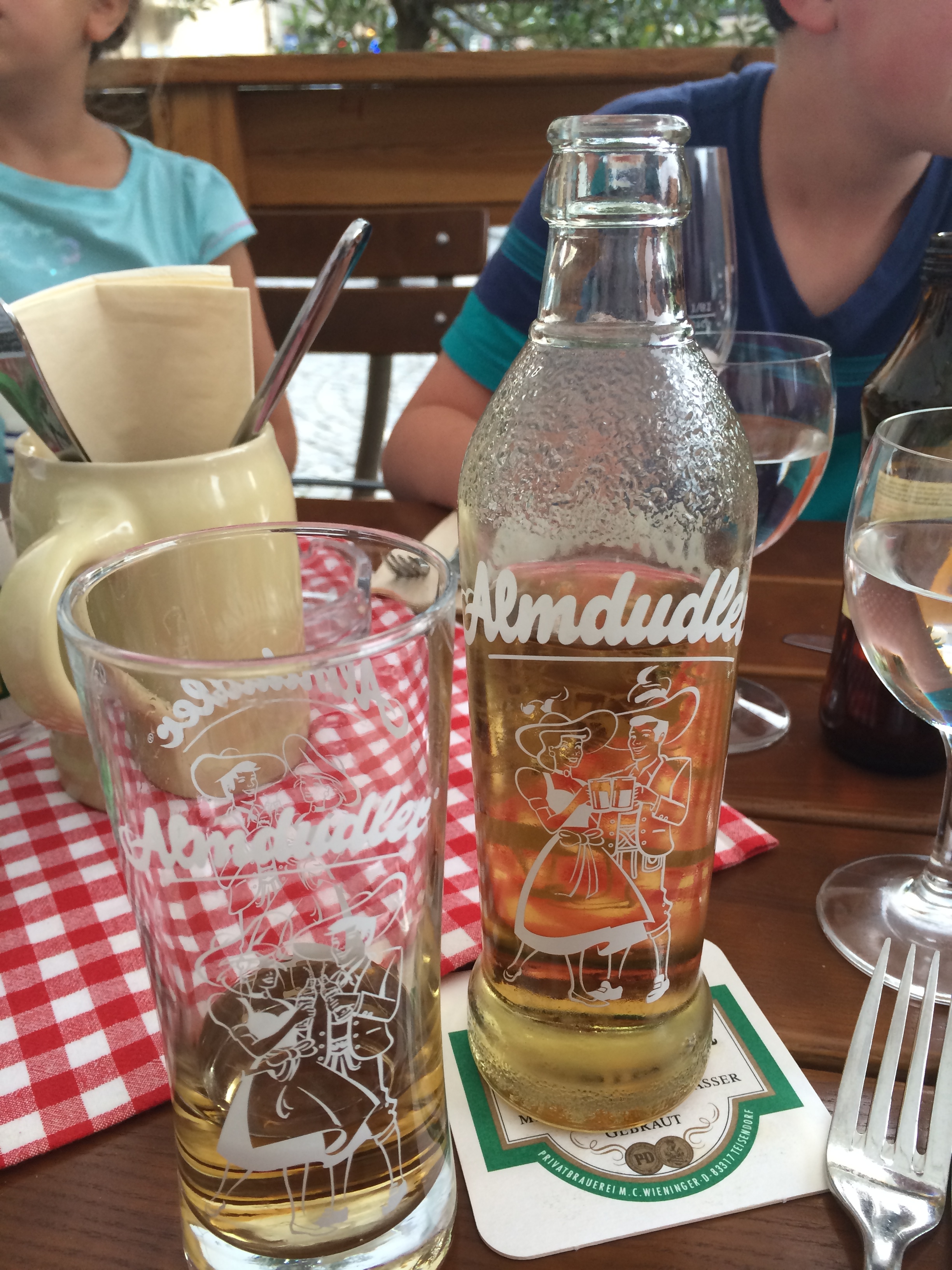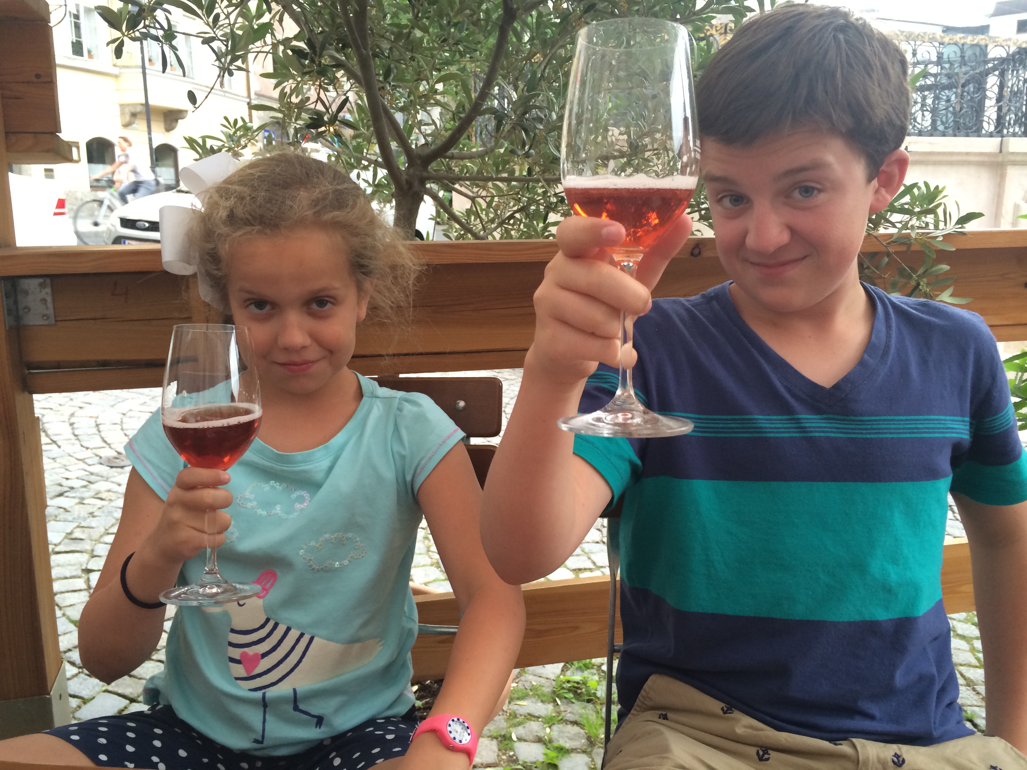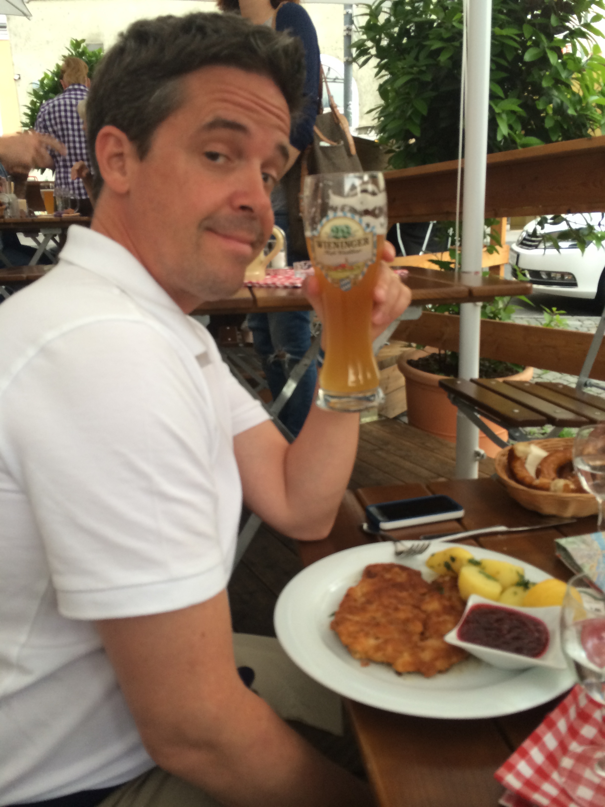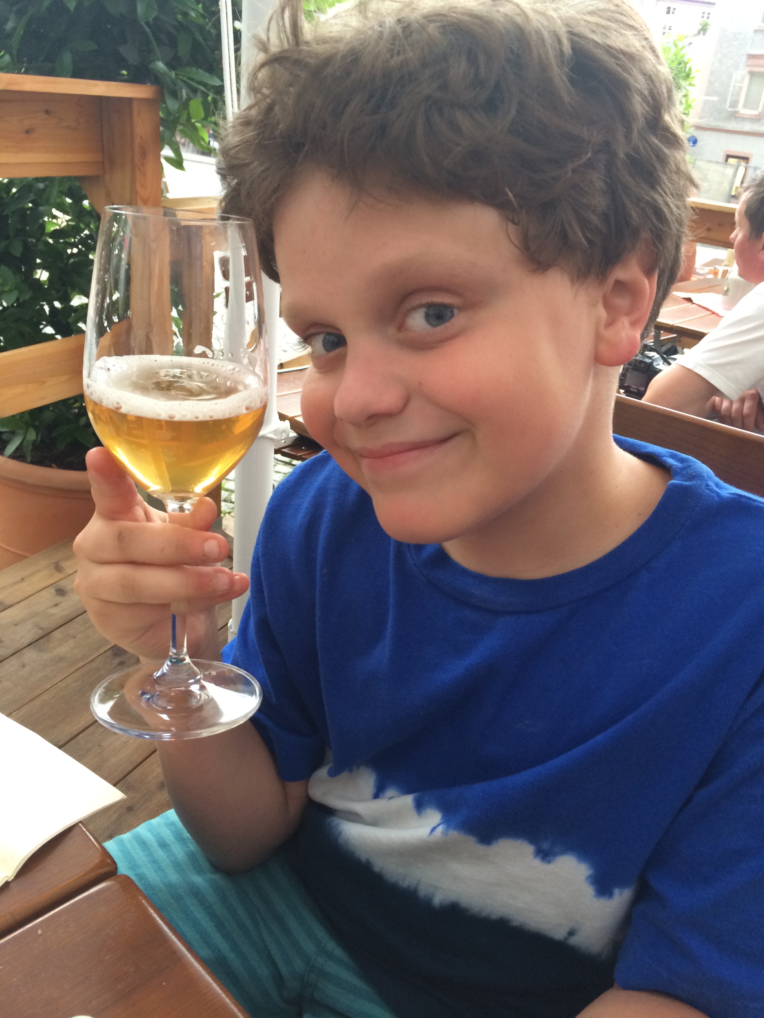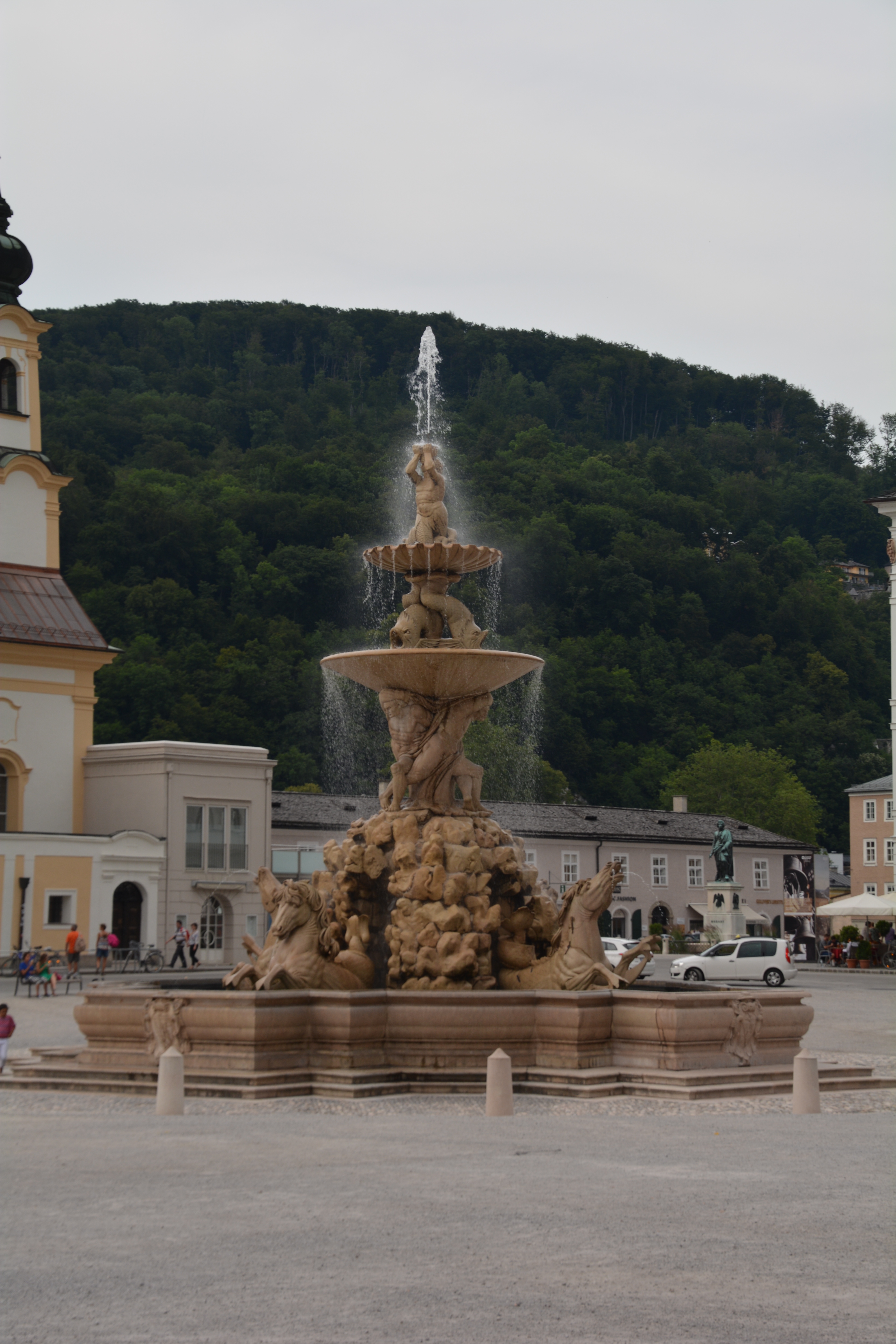 Into old-town Salzburg for a walk before dinner. We found a parking garage for the car and strolled through the narrow streets before ending up in the central “platz”, where we spotted our first Sound of Music landmark – the horse fountain shown in “I Have Confidence”. With photos and the requisite reenactment out of the way, we toddled past Mozart’s birthplace looking for a place for dinner. With a little luck, LouAnn and I found the exact same café we had loved so much 19 years earlier, and we all settled in for a wonderful Austrian dinner of schnitzel, pretzels, and beer. (well, ONE of us had all three) The kids tried fancy, local soft drinks that were served in WINE GLASSES, so they thought that was VERY grown-up. LouAnn and I grinned at each other all evening, soaking in the nostalgia of our 19-year return.