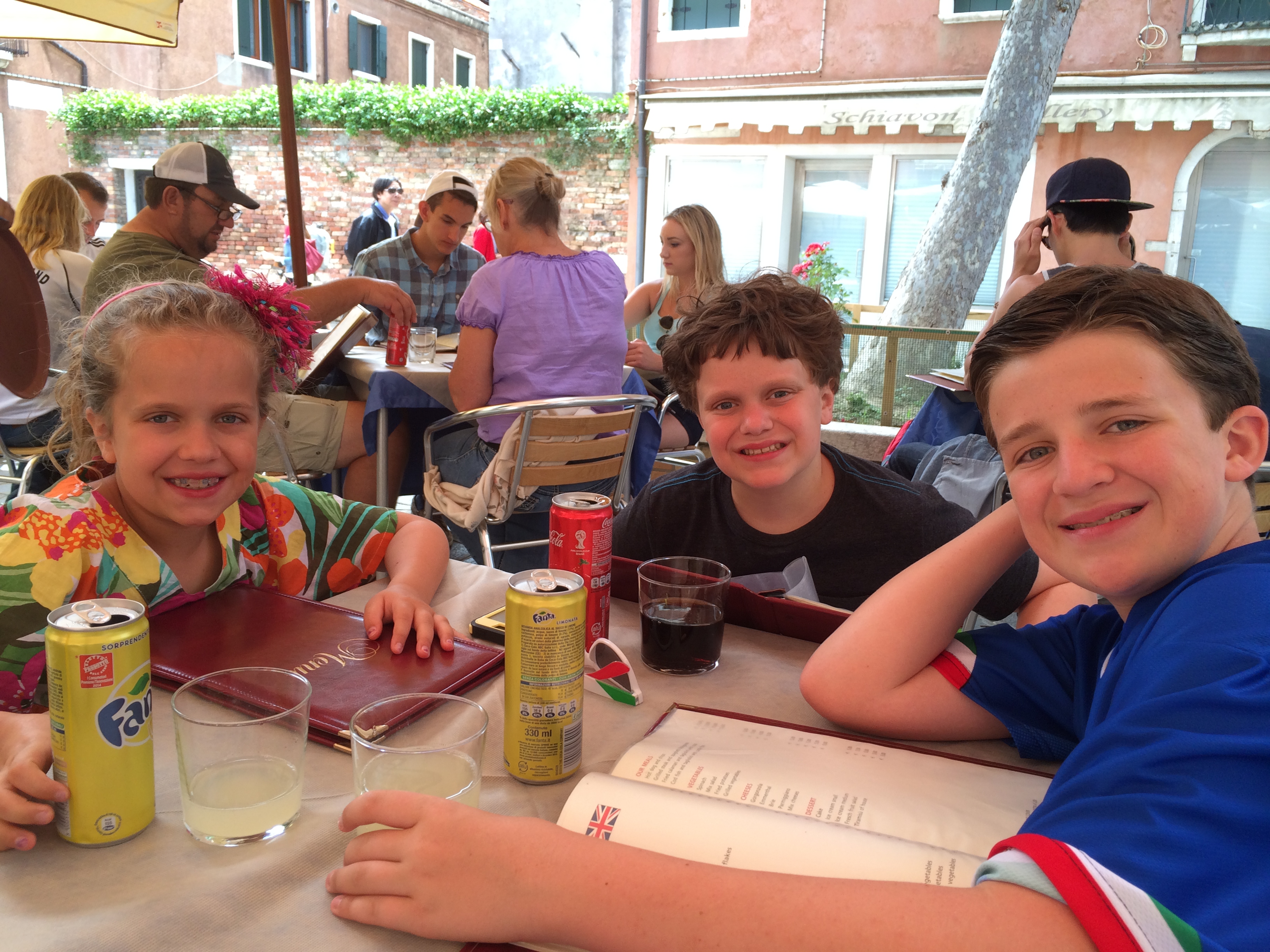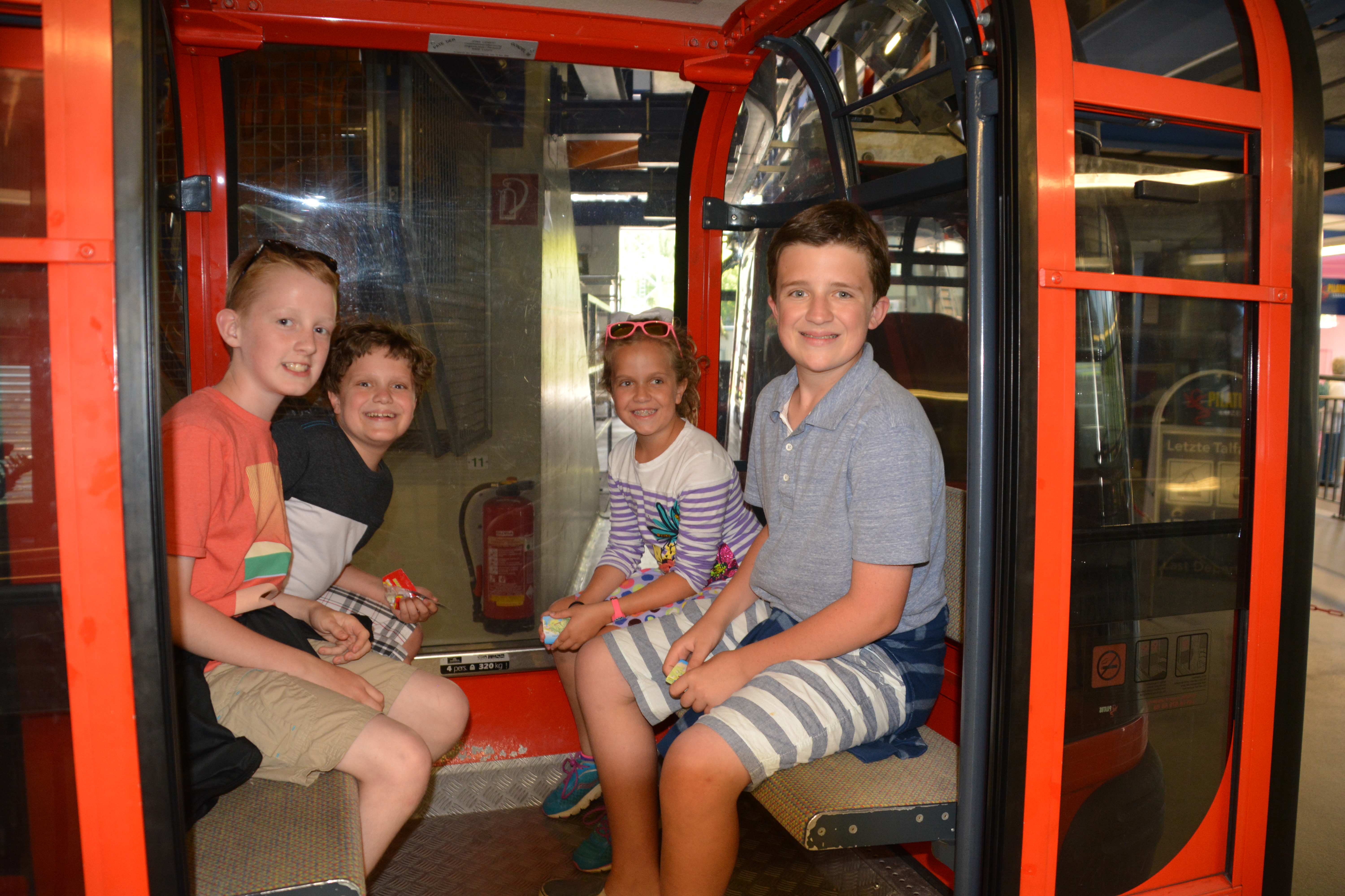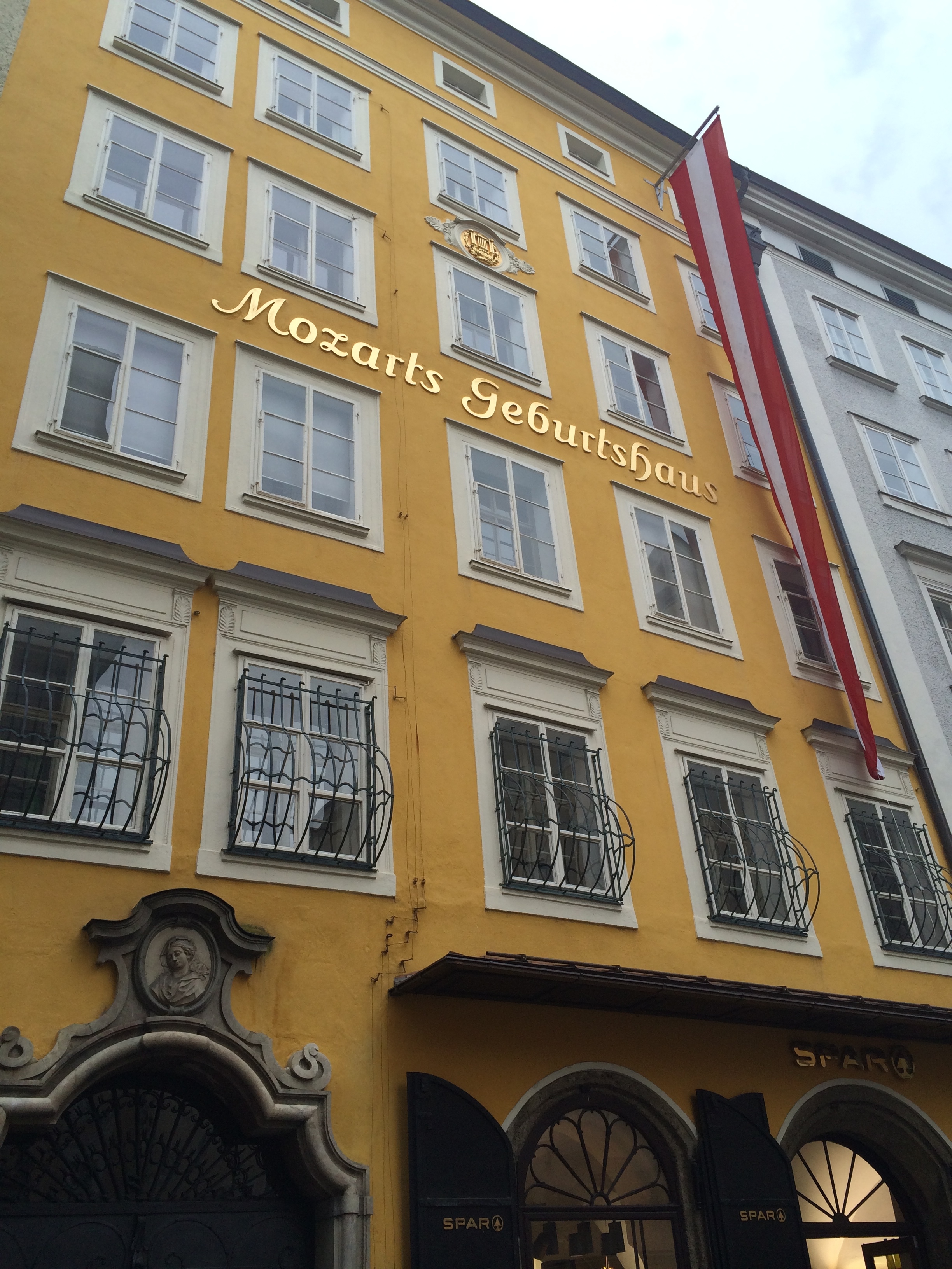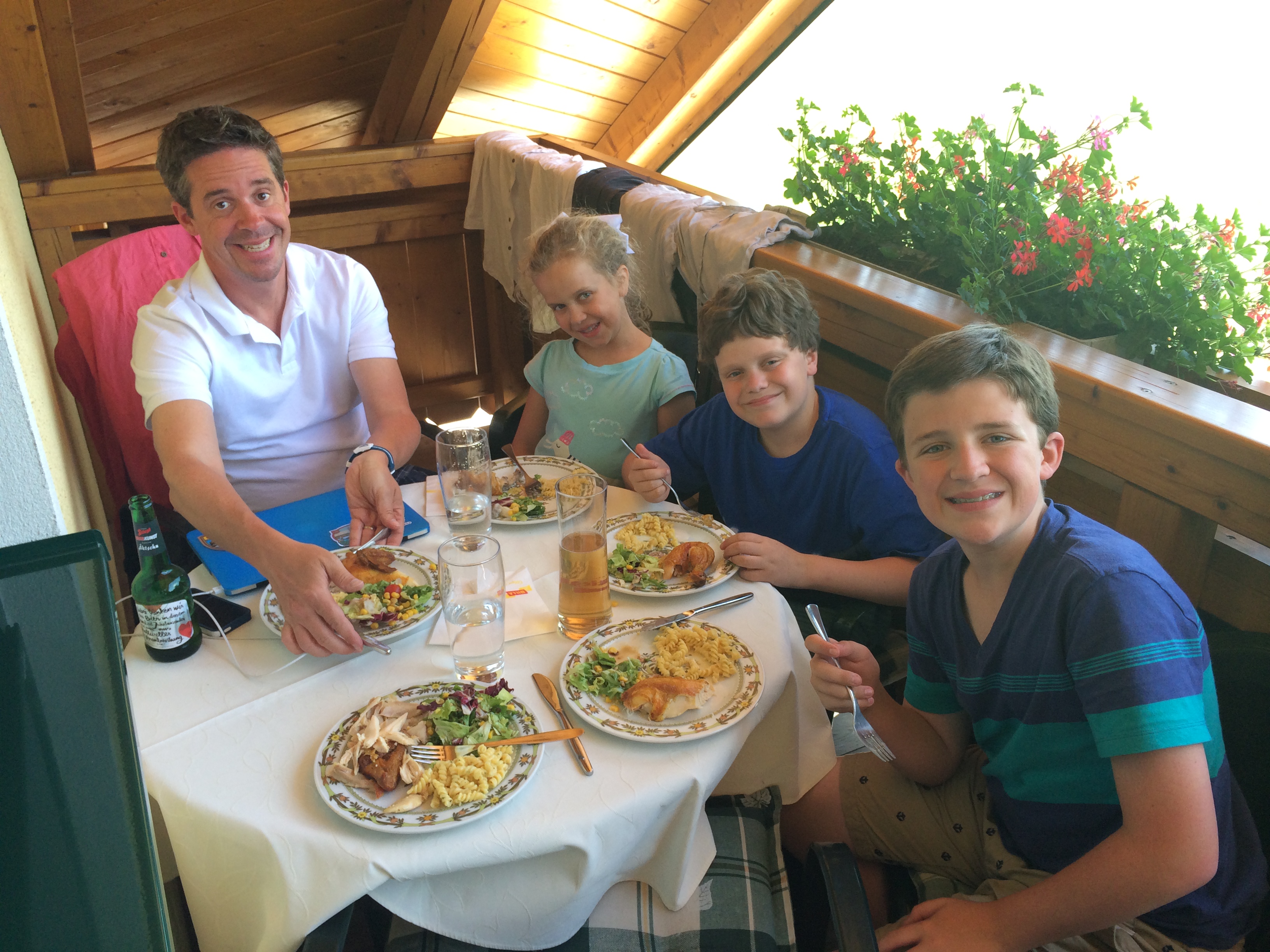 Into old-town Salzburg for a walk before dinner. We found a parking garage for the car and strolled through the narrow streets before ending up in the central “platz”, where we spotted our first Sound of Music landmark – the horse fountain shown in “I Have Confidence”. With photos and the requisite reenactment out of the way, we toddled past Mozart’s birthplace looking for a place for dinner. With a little luck, LouAnn and I found the exact same café we had loved so much 19 years earlier, and we all settled in for a wonderful Austrian dinner of schnitzel, pretzels, and beer. (well, ONE of us had all three) The kids tried fancy, local soft drinks that were served in WINE GLASSES, so they thought that was VERY grown-up. LouAnn and I grinned at each other all evening, soaking in the nostalgia of our 19-year return.