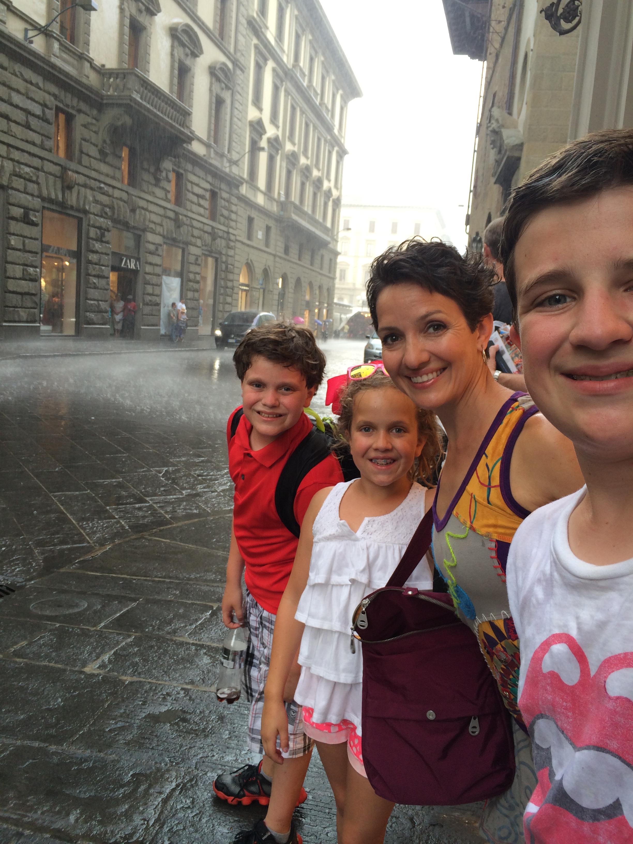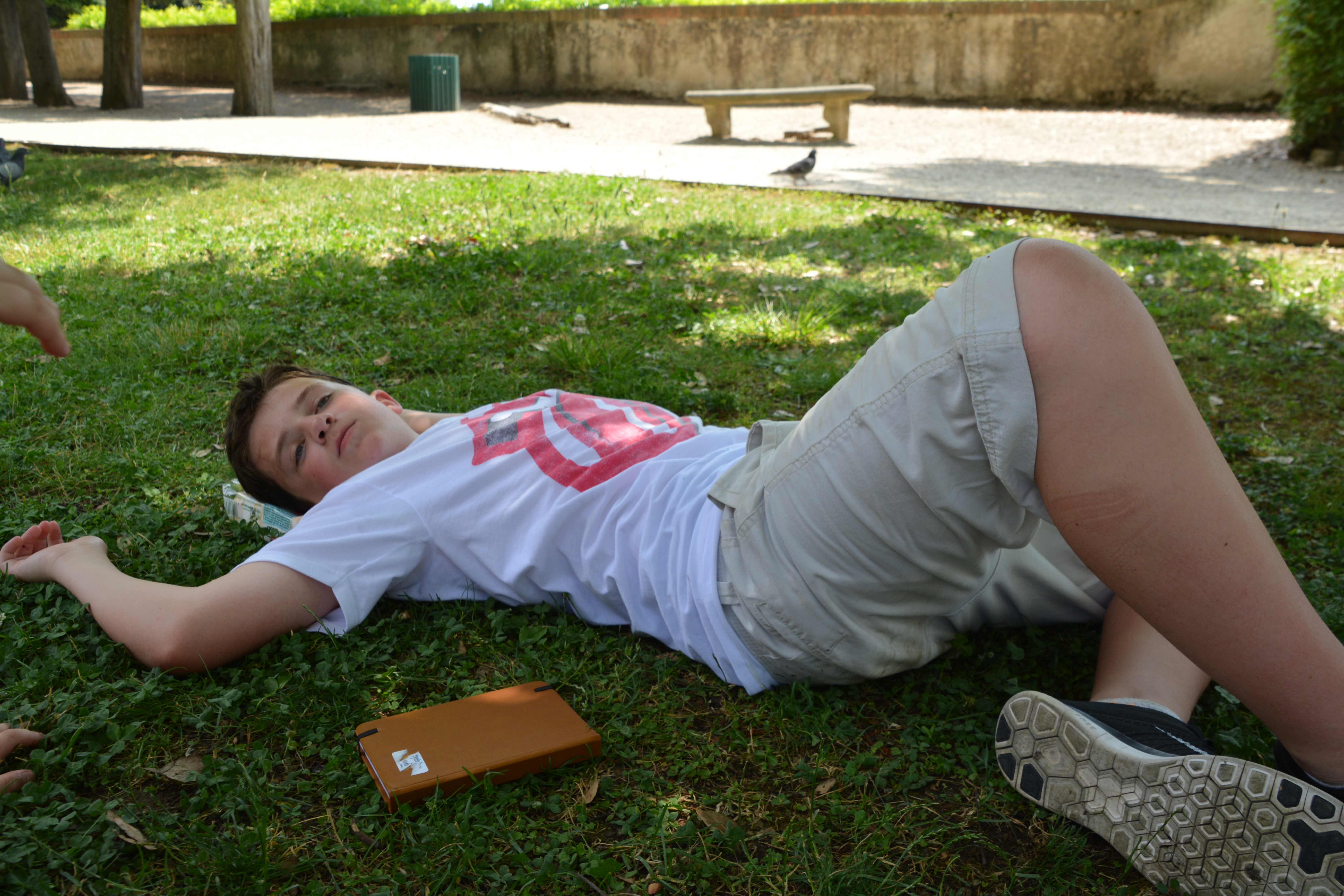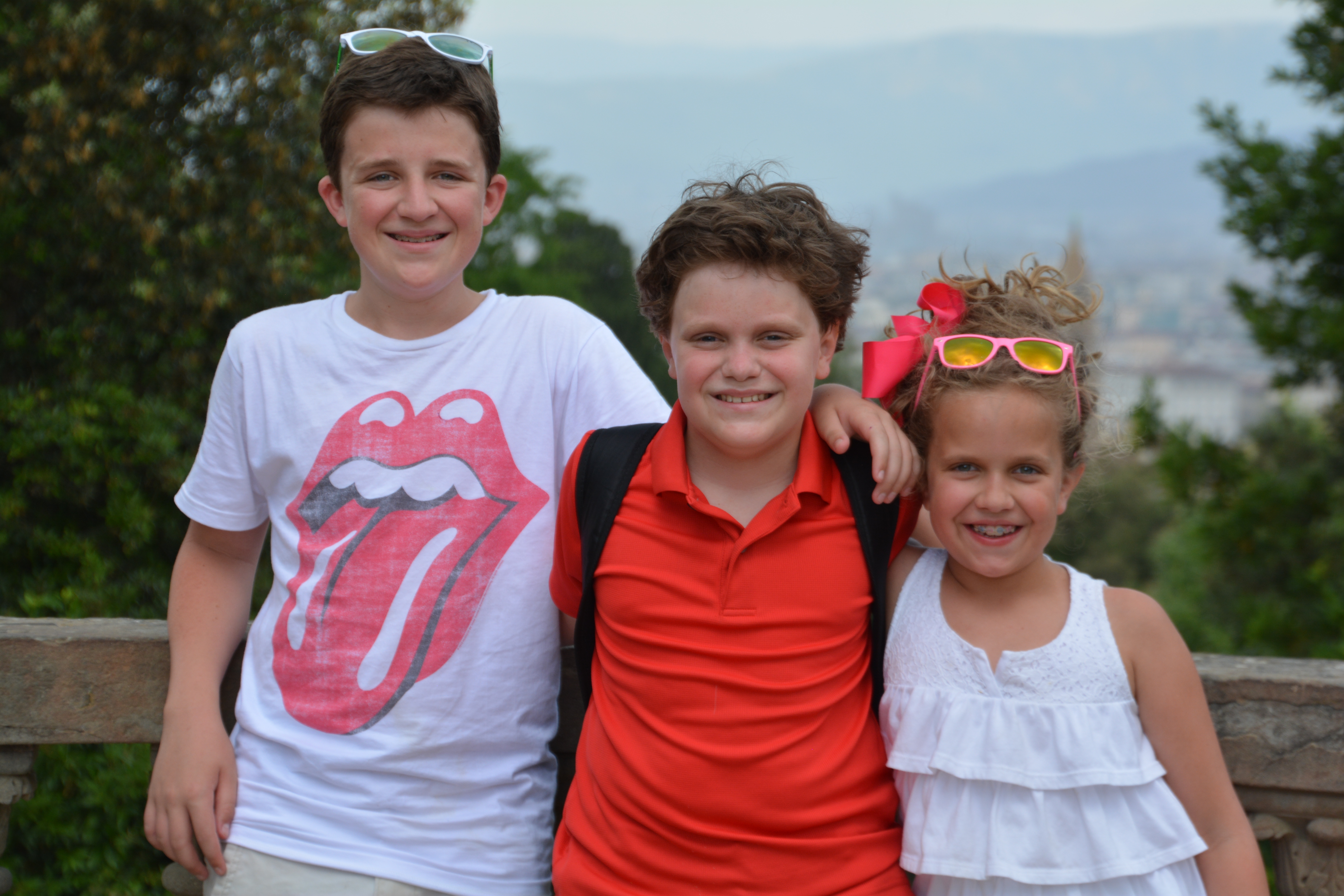 Like every morning, not up-and-at-‘em as early as we wanted… felt so good to sleep in. Headed to Florence again for Day 2. After parking in our Garage of Shame, we walked to a local market for some picnic supplies, then made our way to Boboli Gardens, again (remember, we showed up after closing time yesterday), for a fun lunch. It was a blisteringly hot walk up to the perfect picnic spot, and we were all thankful to gather in the shade. The Boboli Gardens belonged to the Medici family during the Renaissance, and were only available and open to the Royal family. They are HUGE! They are built up on a hill overlooking Florence – this had never been done before. There was no water supply up that high, so they had to build an elaborate system to pipe water up from the Arno River. Gorgeous statues, fountains, mazey walks through manicured hedges and beautiful overlooks. We played a mean game of “Boboli Ball” with our best purchase on the trip so far: in Rome we bought a very brightly striped, cheap play ball. He has become our “Wilson” – our constant companion. He has provided hours of entertainment for us all.