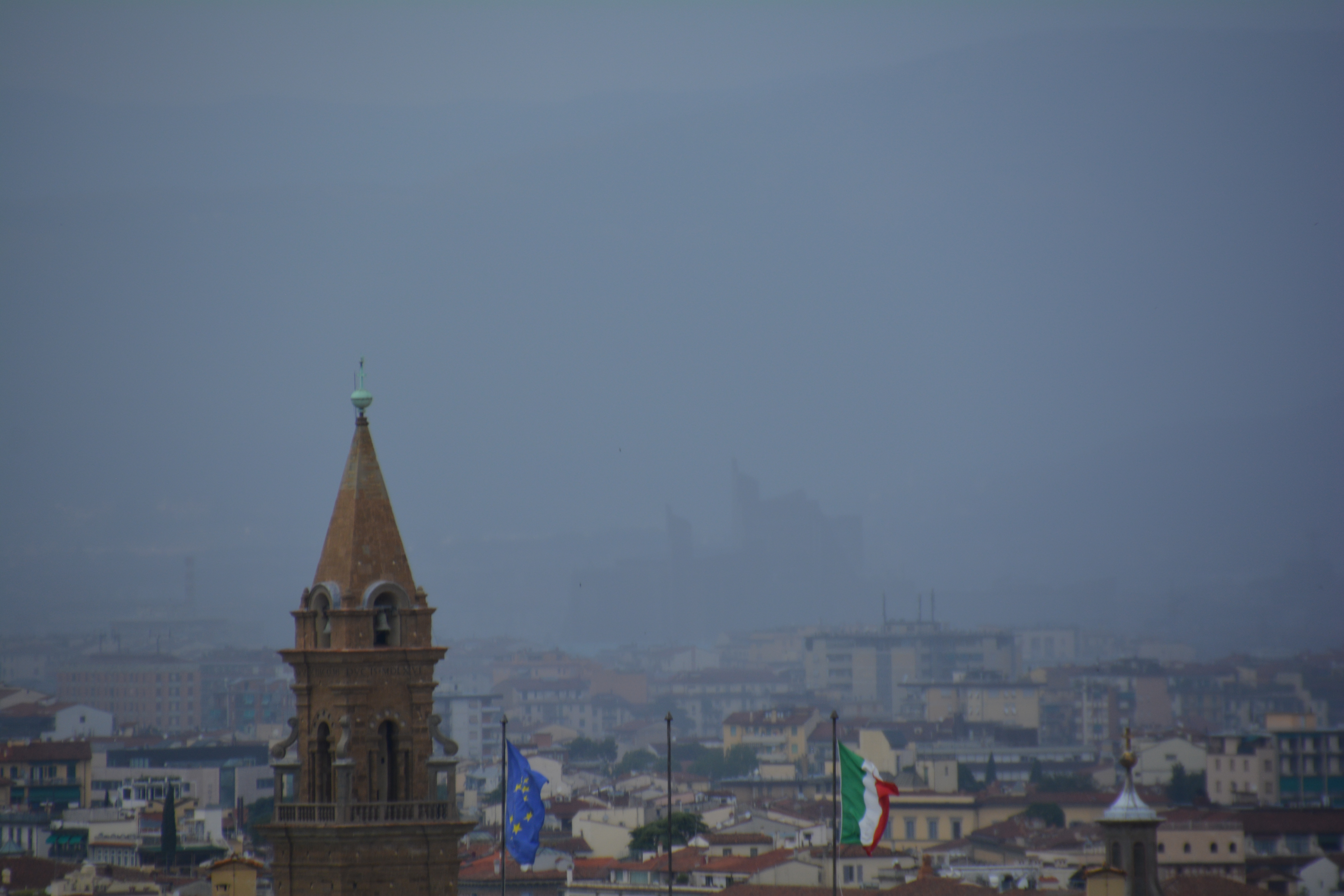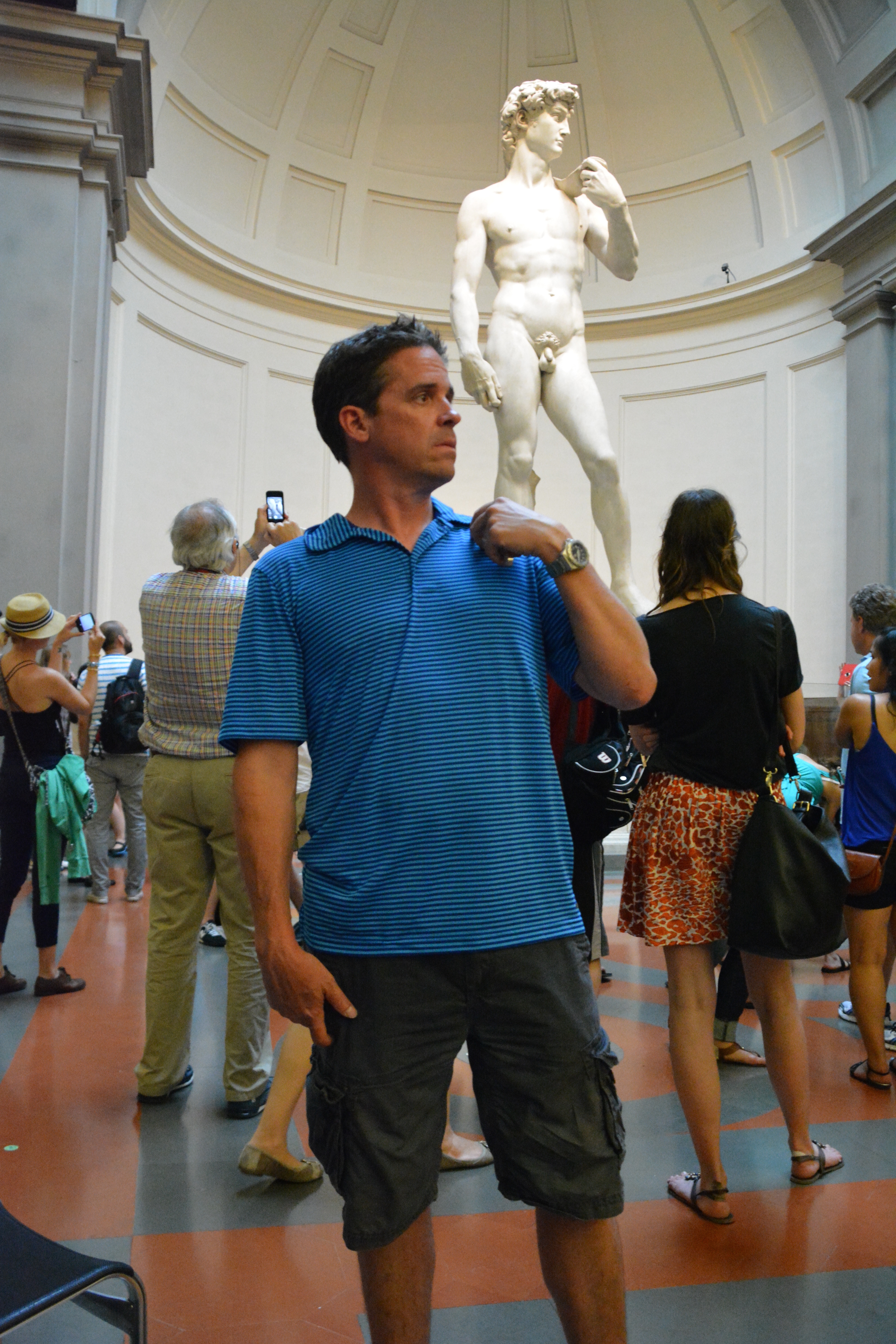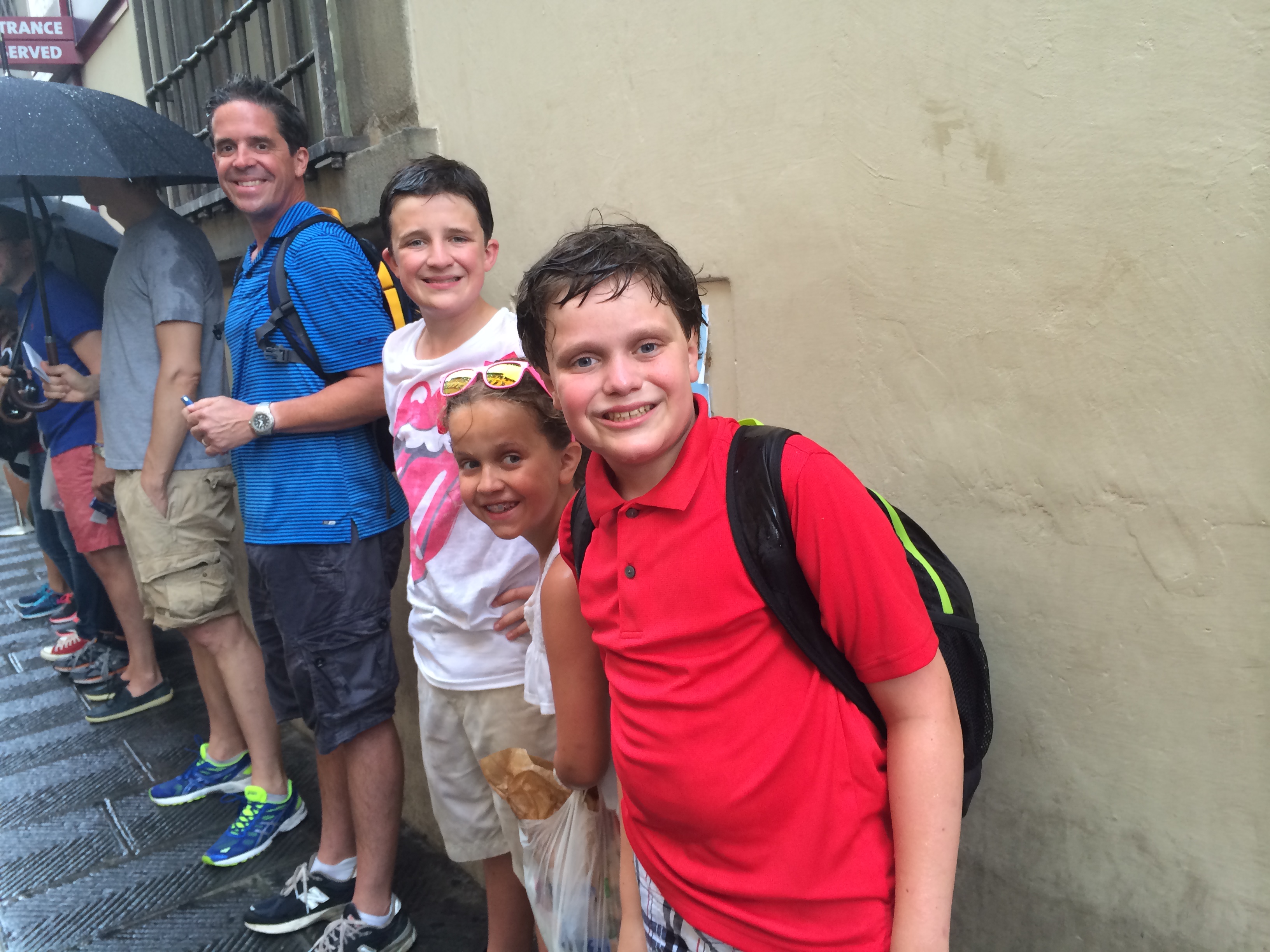 For the first time in 10 days, a breeze began to blow. The sky darkened, thunder began to roll, and……rain!!! Isolated, but rain! Standing at the high point in the gardens we could see the isolated pockets of rain moving across Florence. Very cool! It held off long enough for us to finish our time in the gardens and begin our trek across town to the Galleria dell’Accademia for our timed entrance to see the David. Soon, it really started coming down and we were caught in a proper downpour – our new raincoats safely tucked away in our suitcases in the villa. Where did all these umbrella salesmen come from and where did all the toy peddlers go?? By the time we got to the museum, we had fended off 172 umbrella salesmen and were totally drenched. Luckily, we had bought tickets ahead of time and didn’t have to wait in the 1 ½ hr. line to get in.