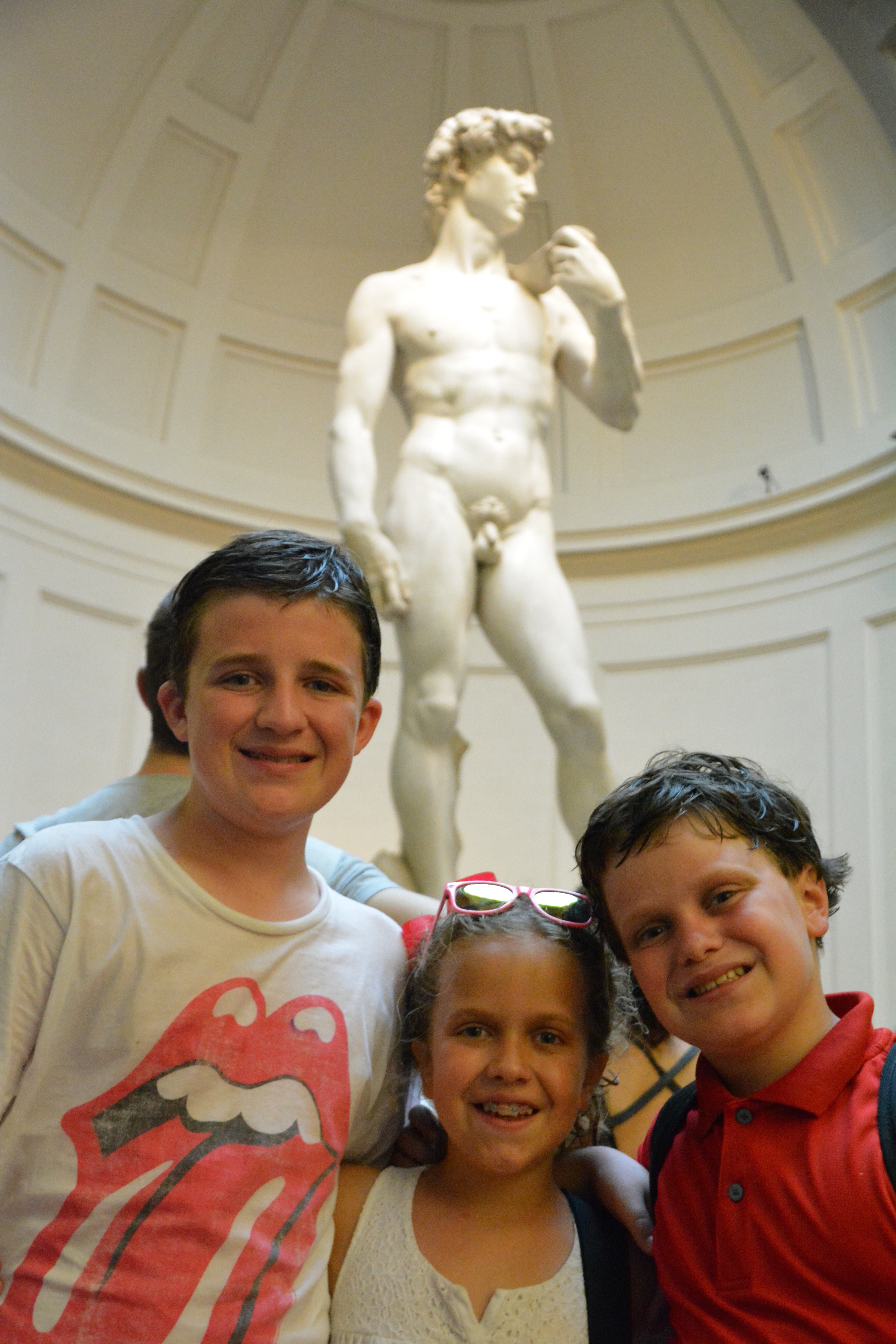 On to David. Michelangelo was only 26 years old when he began in 1501, and it took him two years to complete. The kids were appropriately struck by the lifelike detail of his muscles, the veins in his arms and hands. We stood in awe and wondered about the tools Michelangelo used and what life was like for him while he worked on it.