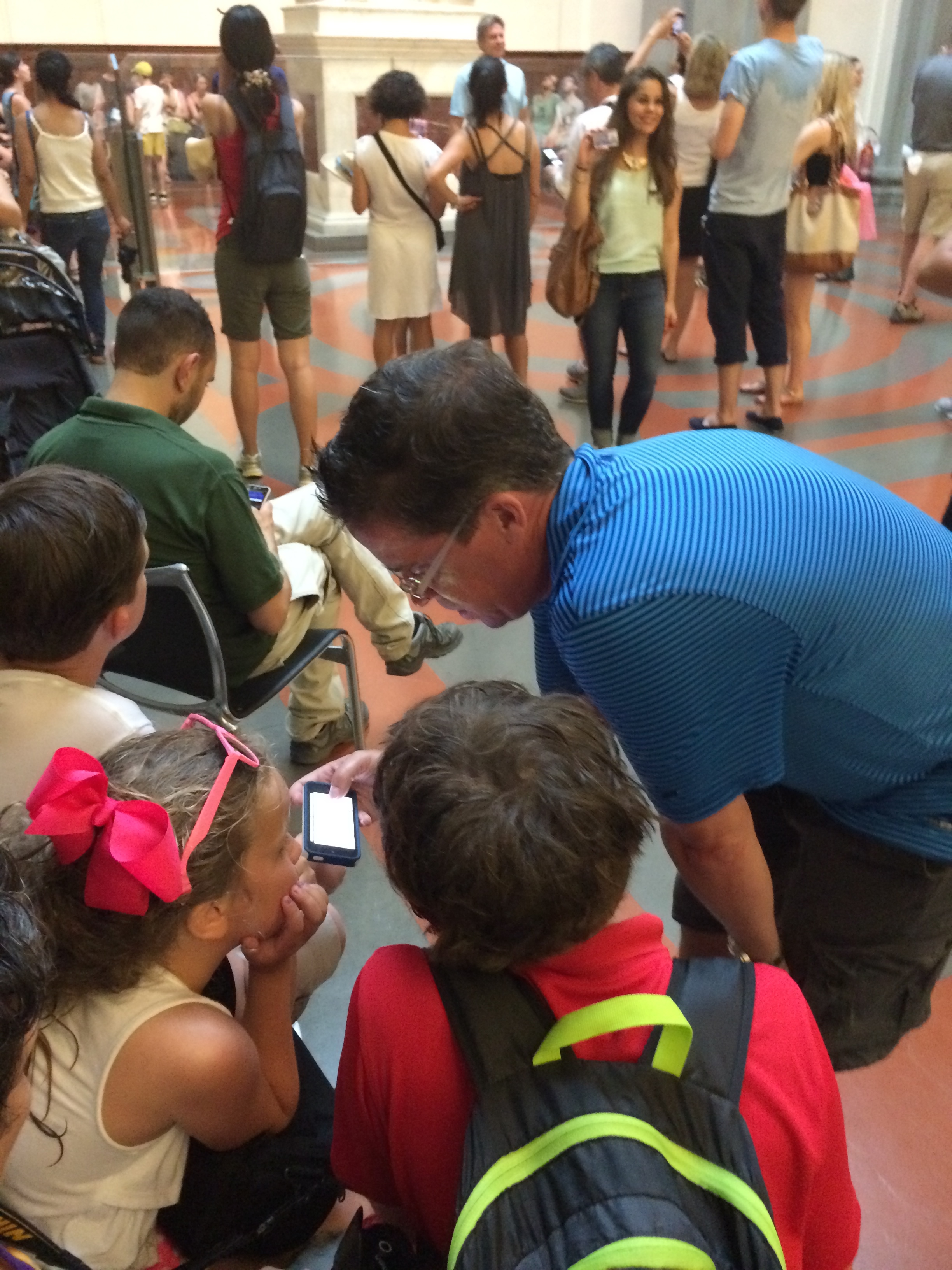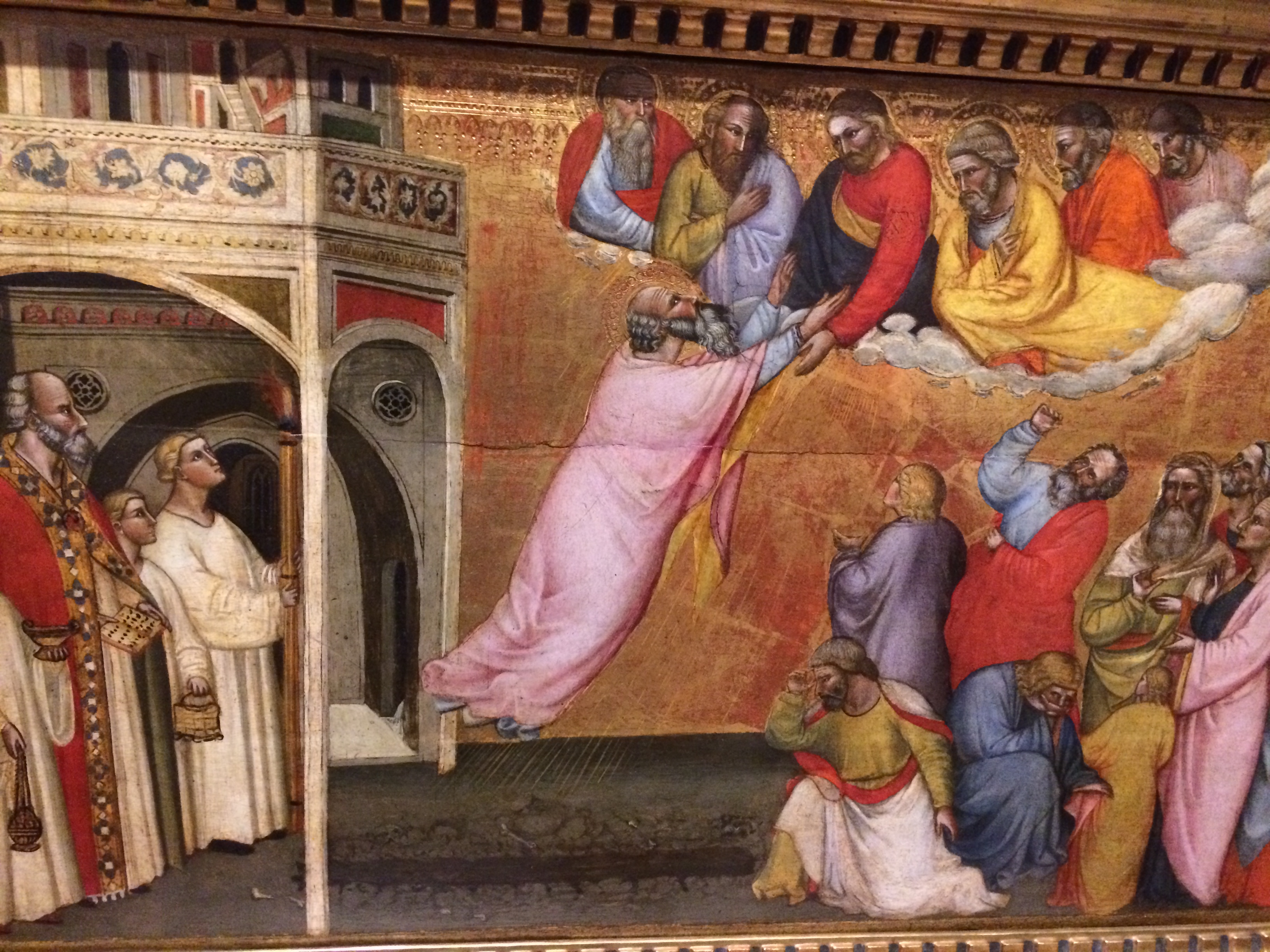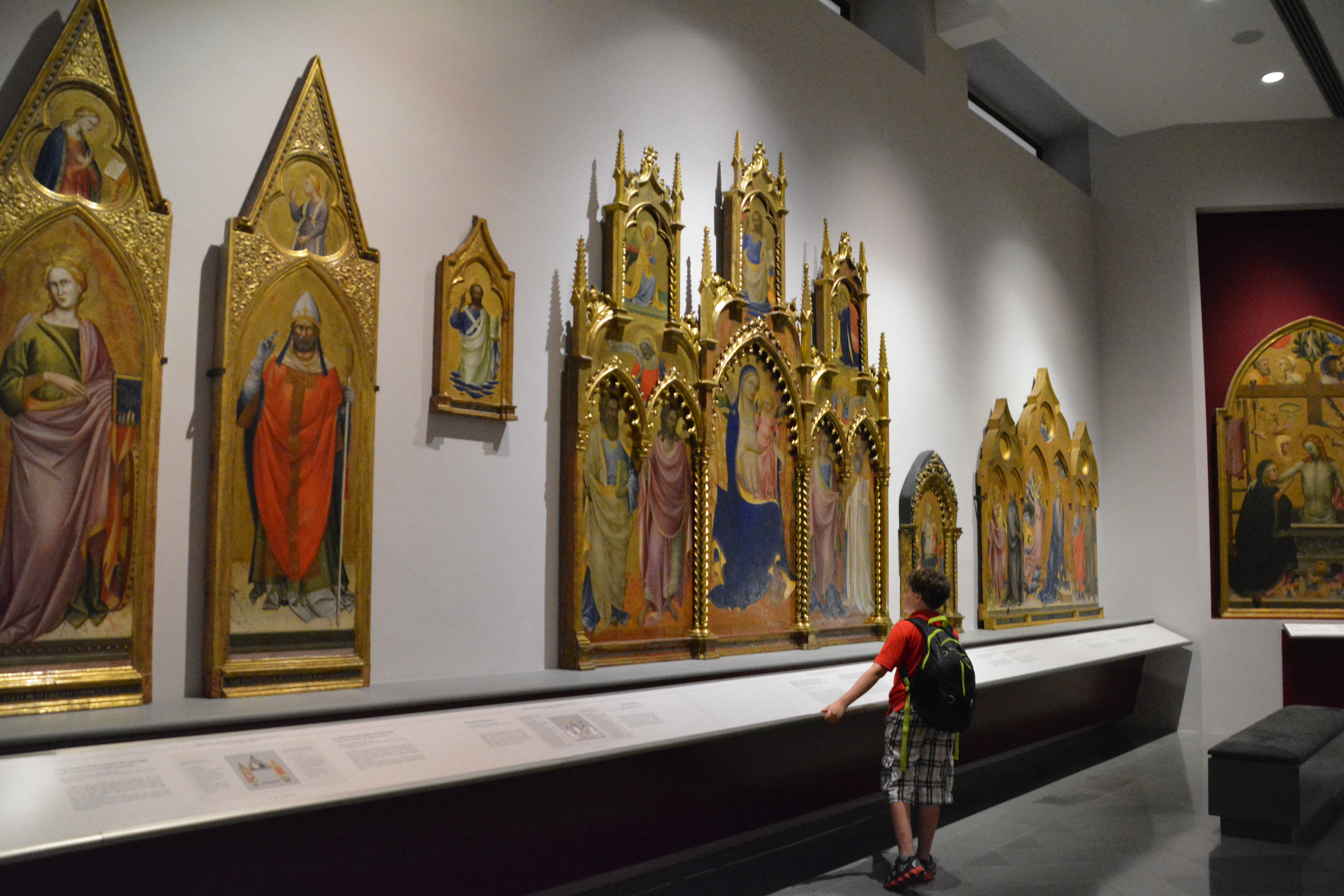 We also enjoyed the rest of the Galleria dell’Accademia. Wonderful paintings and an amazing 14th century, 12-foot long altar cloth, embroidered with gold and silk thread, depicting all the apostles and Mary at Pentecost. It was stunning. SOLID embroidery. Ellis LOVED it – he really did.