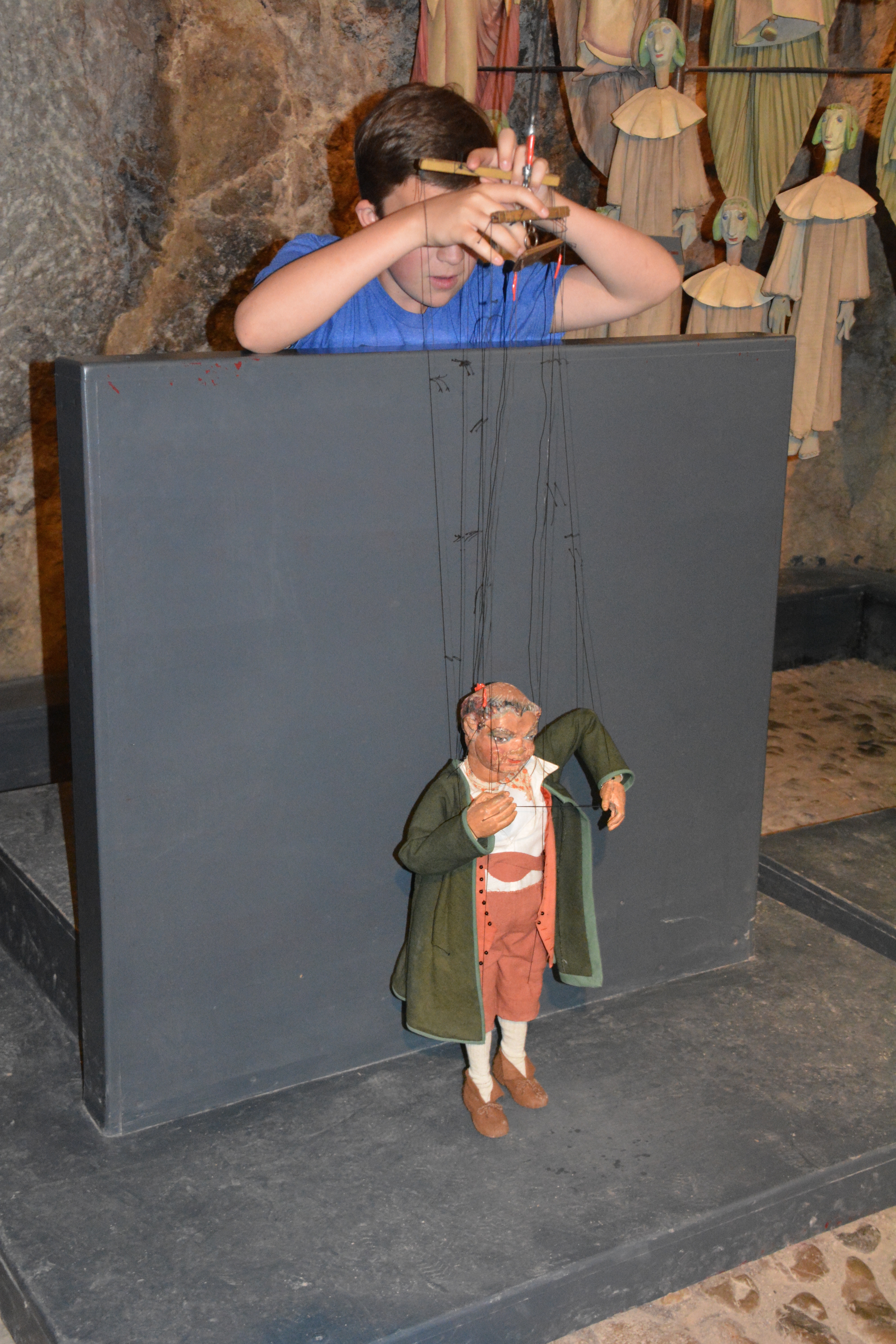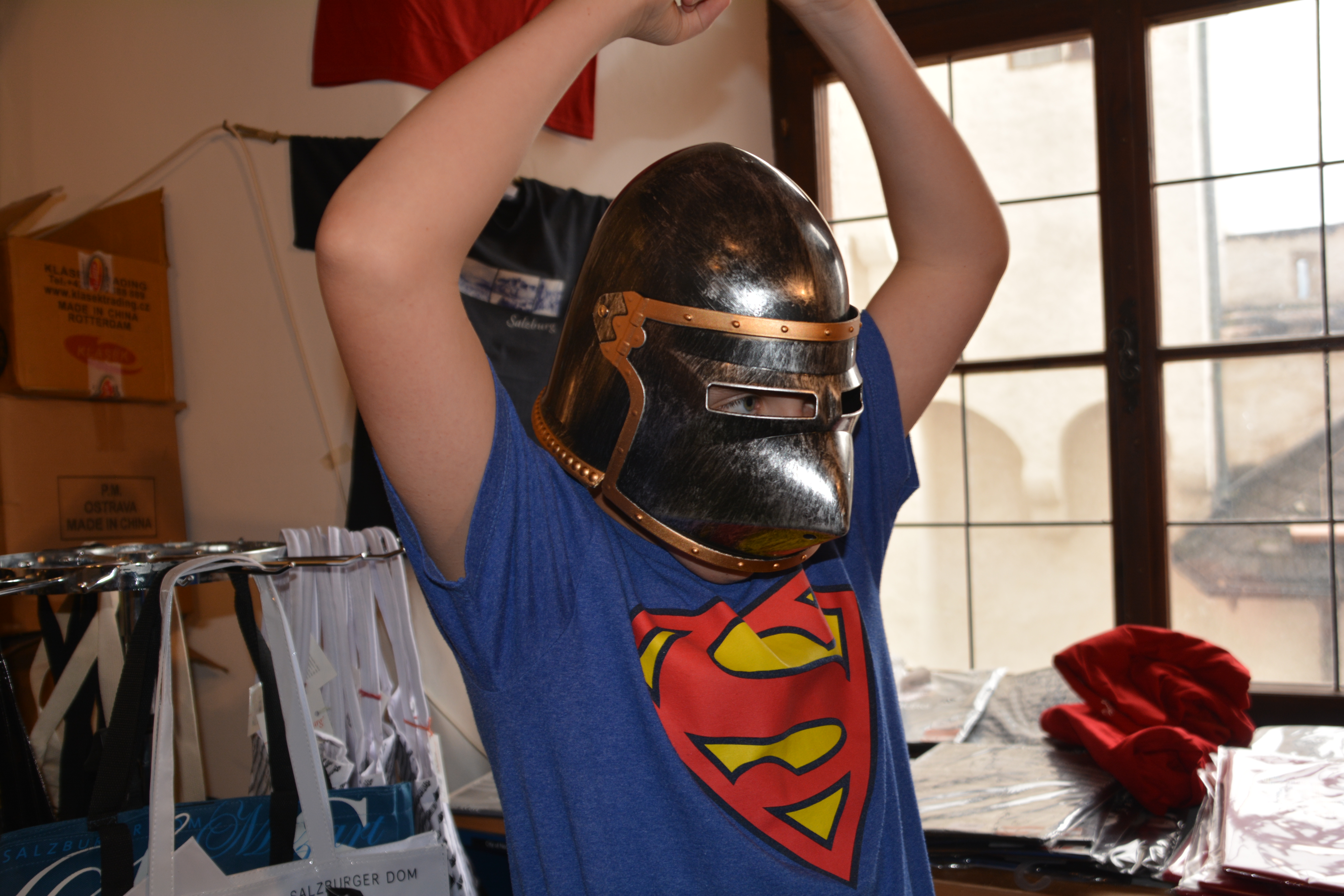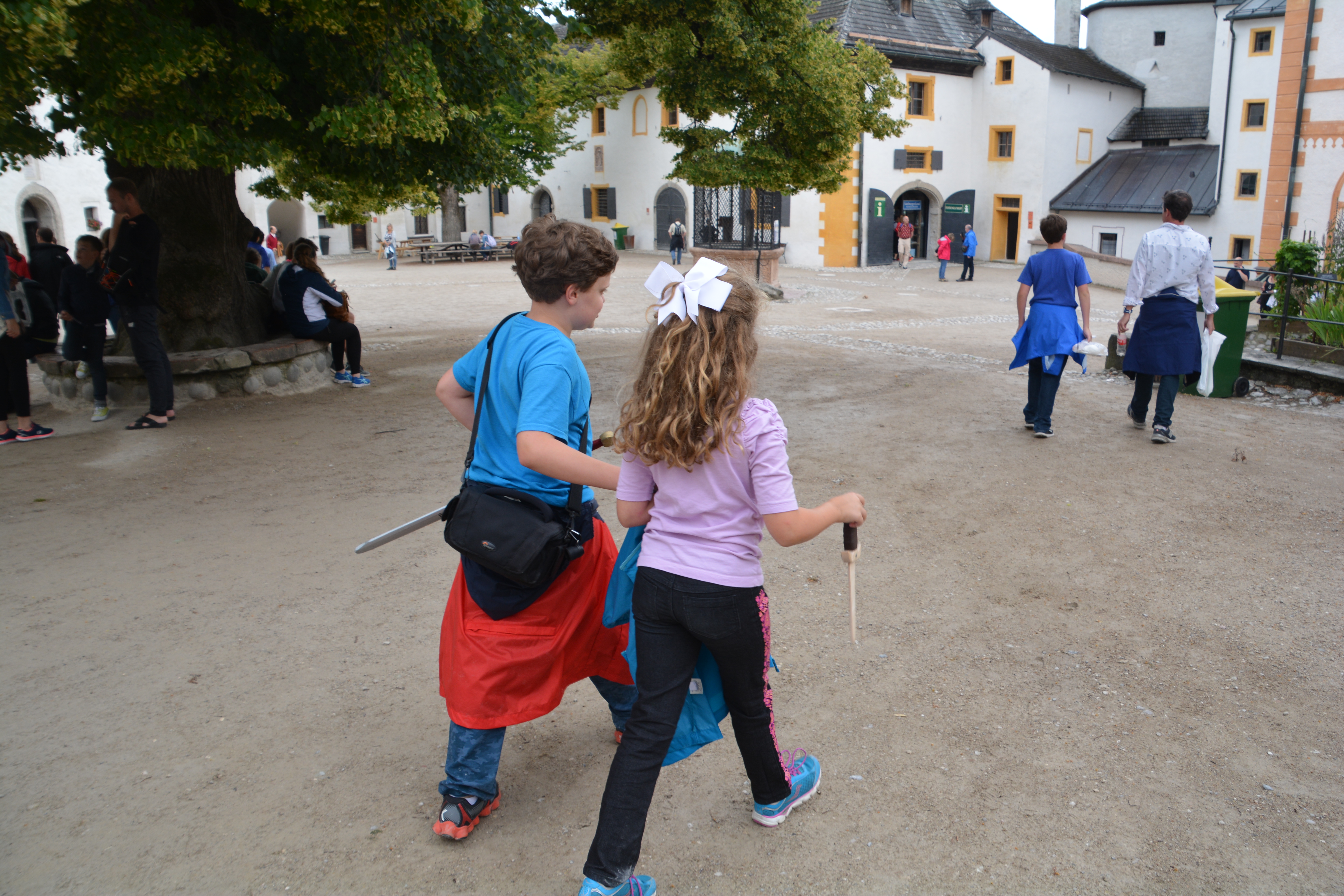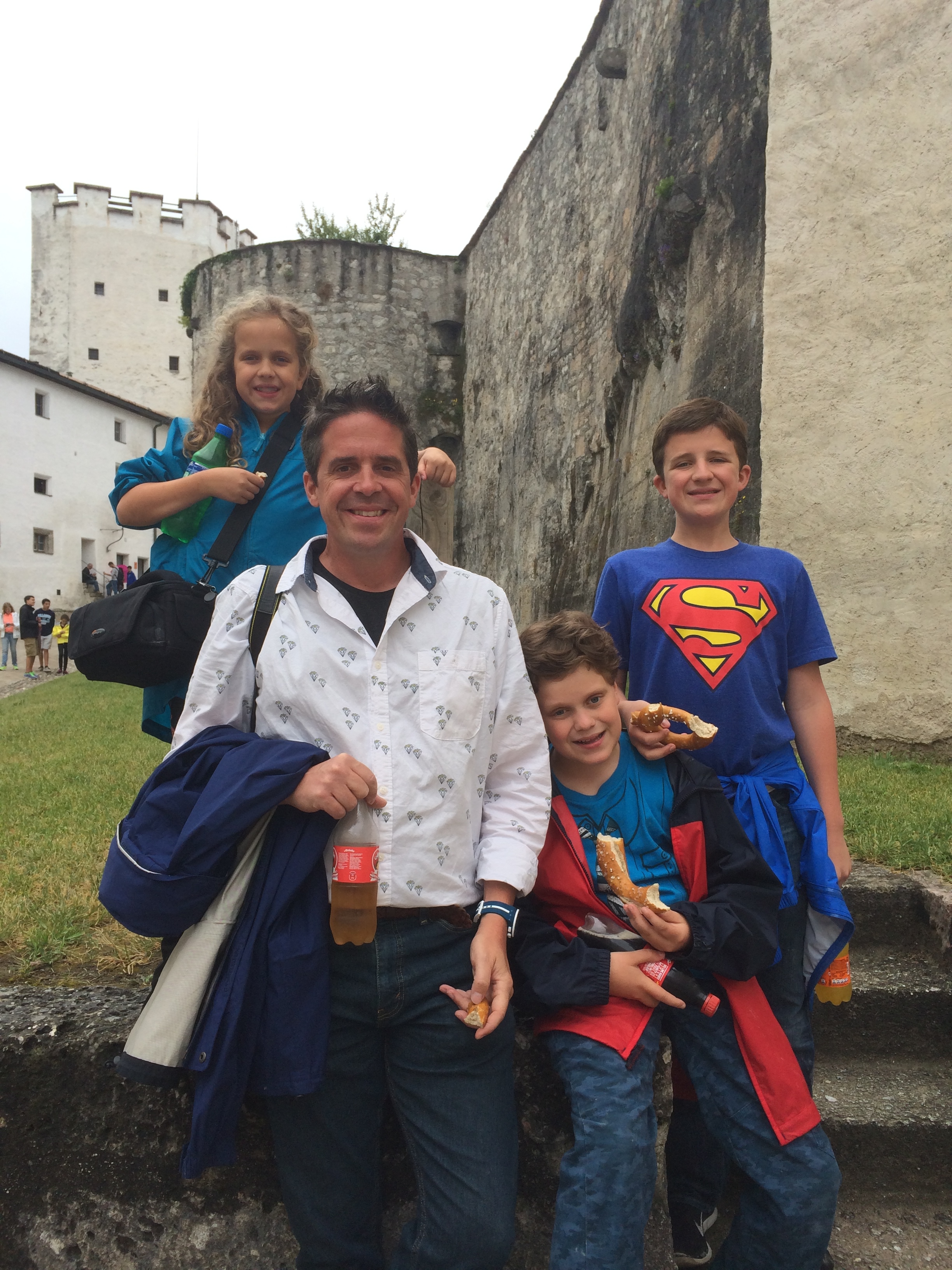 As usual, we got the audio tour – of the inner rooms, king’s residence, torture chamber, etc. The fortress was begun in the early Roman times, then in the 1100’s the early structure was built and improved upon throughout the next few centuries. The last fortification was in the 1500’s. We walked to the highest tower & had a beautiful 360-degree view of Salzburg. The kids were wide-eyed in the torture chamber, which, Mr. Audioguide told us, was NOT the torture chamber after all, just a holding room for prisoners. For now, it just HELD the torture devices they used. Still pretty neat. Paul made us take the obligatory “arms-in-chains-like-a-prisoner” picture before we left. We wandered the grounds and stumbled upon a Marionette Museum – many of which had been used in the Saltzburg Marionette Theatre. Saw lots of original marionettes from the early century. Beautifully crafted characters from operas, mostly. Videos about how they made them, demonstrations, and even one you could play with and dance around. Perfect to see since we are going to see Mozart’s “The Magic Flute” at the Marionette Theatre tomorrow night!