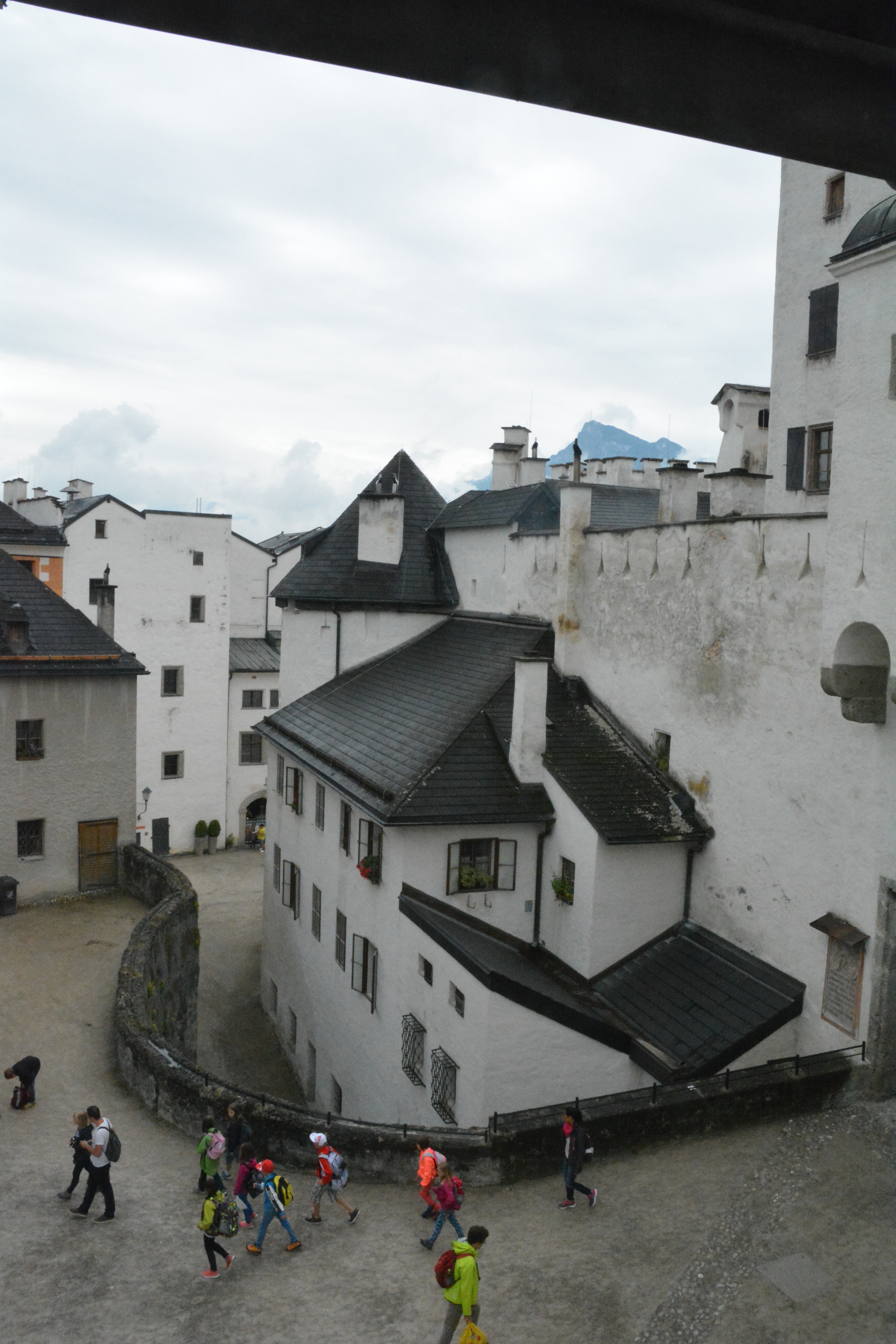 Breakfast downstairs again – kids are getting better at not wasting food. It was a rainy, cool day – 58 degrees- yay! We get to wear our new raincoats again! Today we planned to head into old town Salzburg to tour the Fortress. We bought tickets to the funicular, which took us straight up the mountain to the foreboding Fortress.