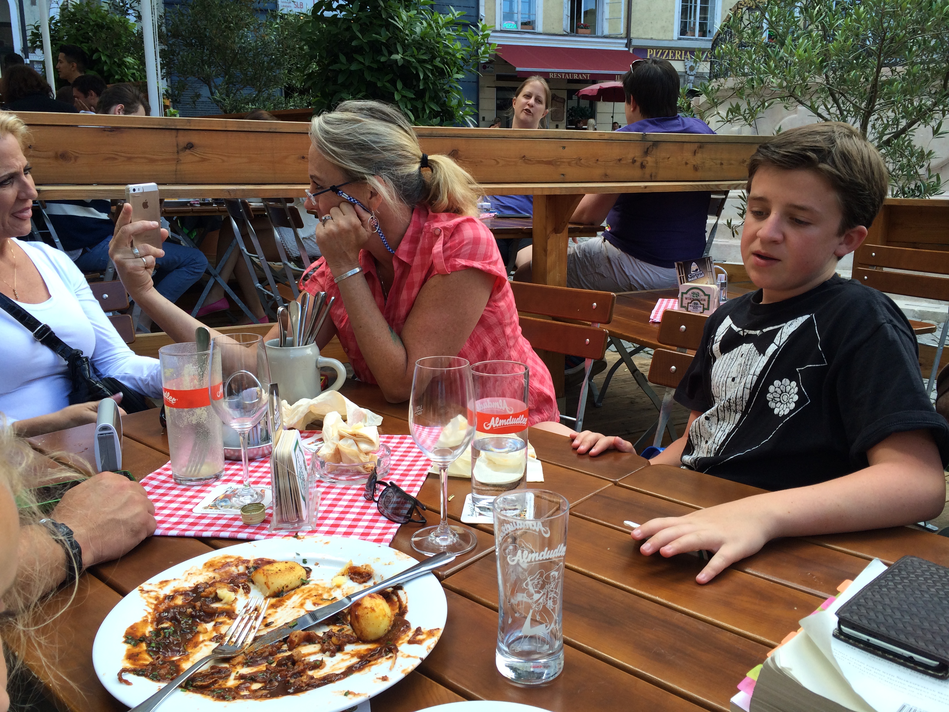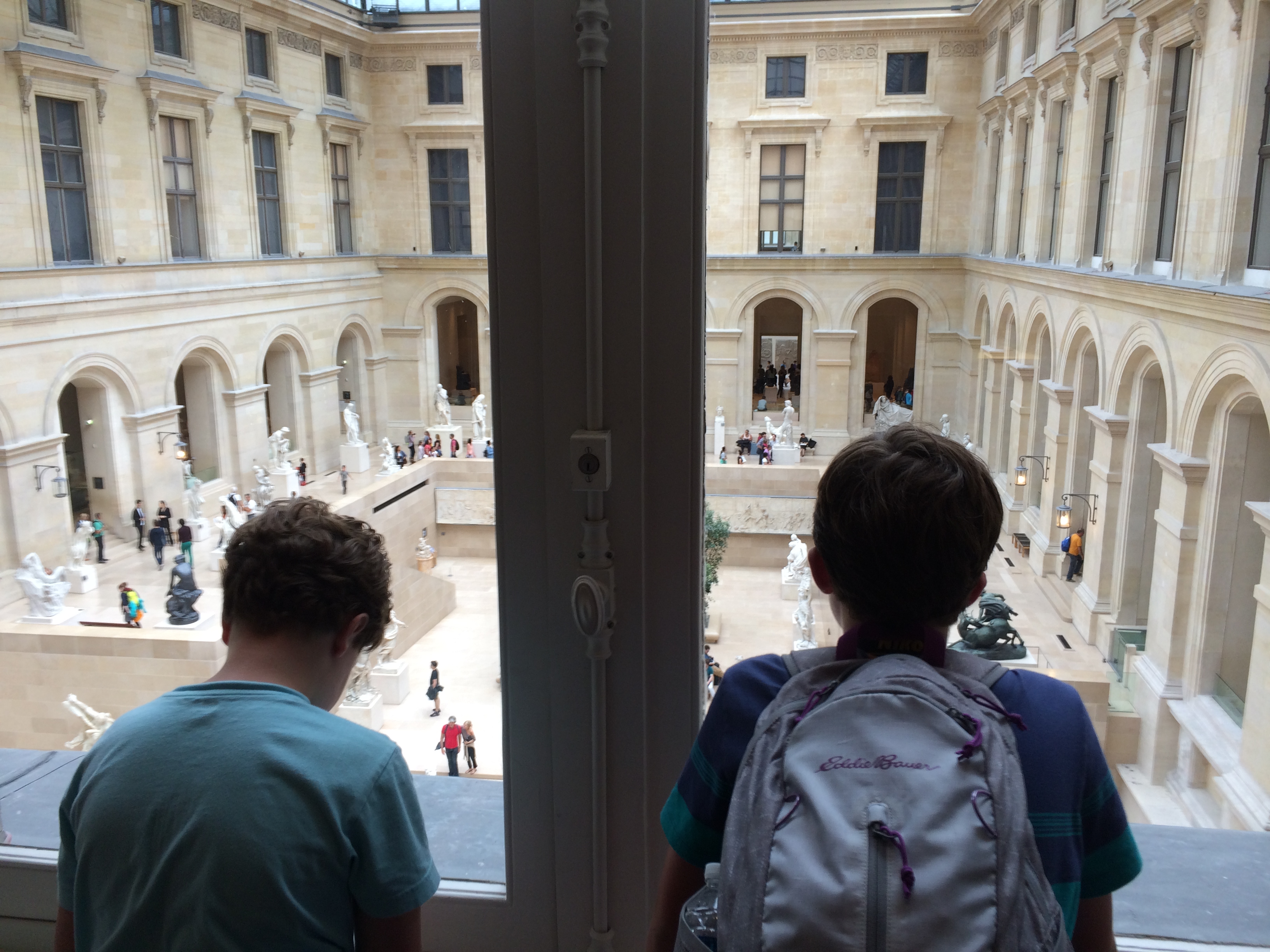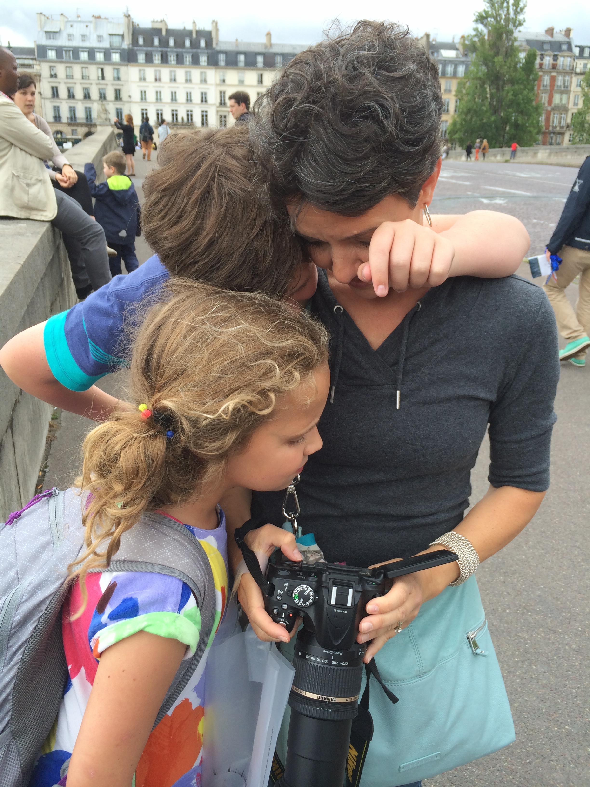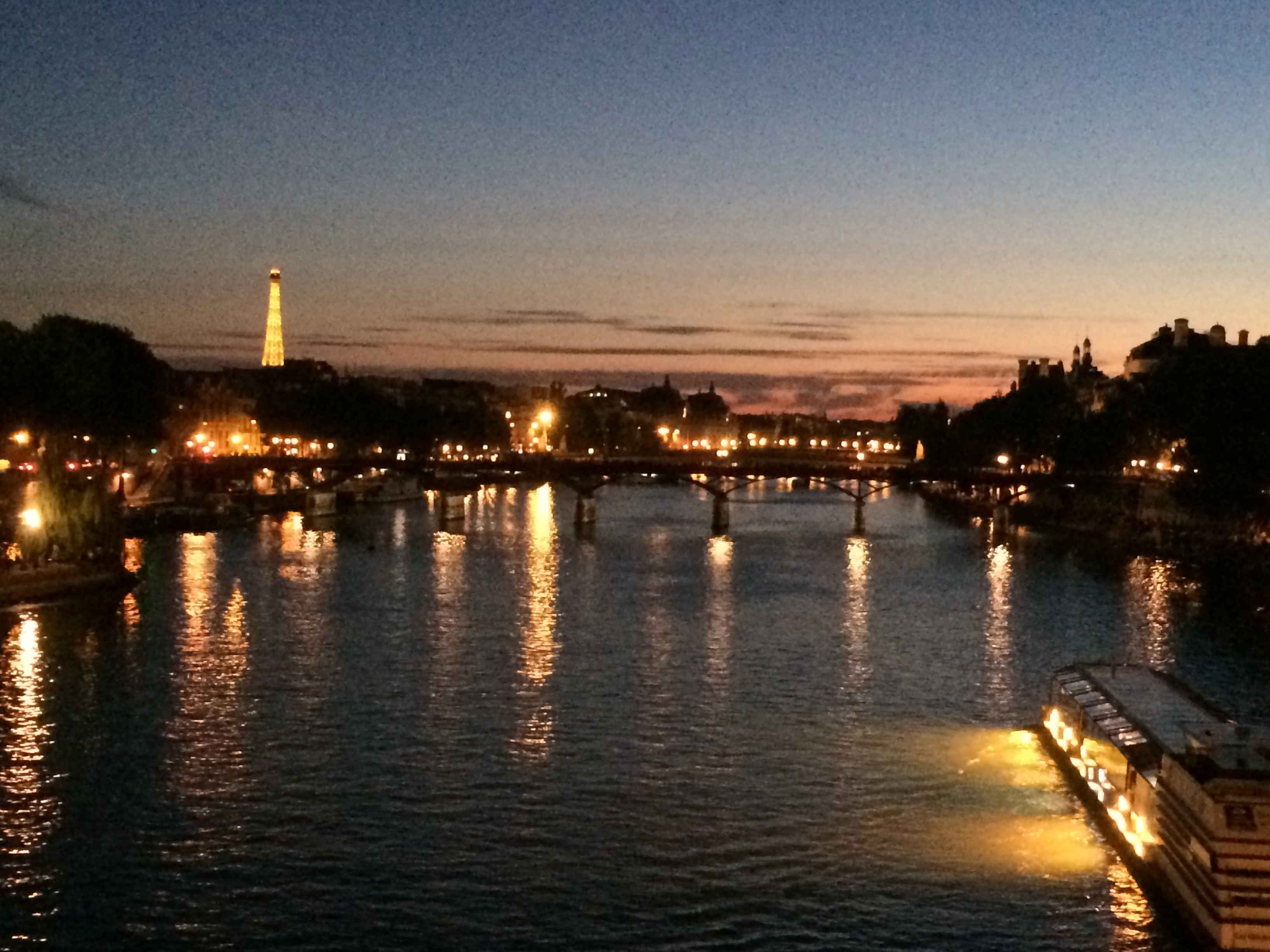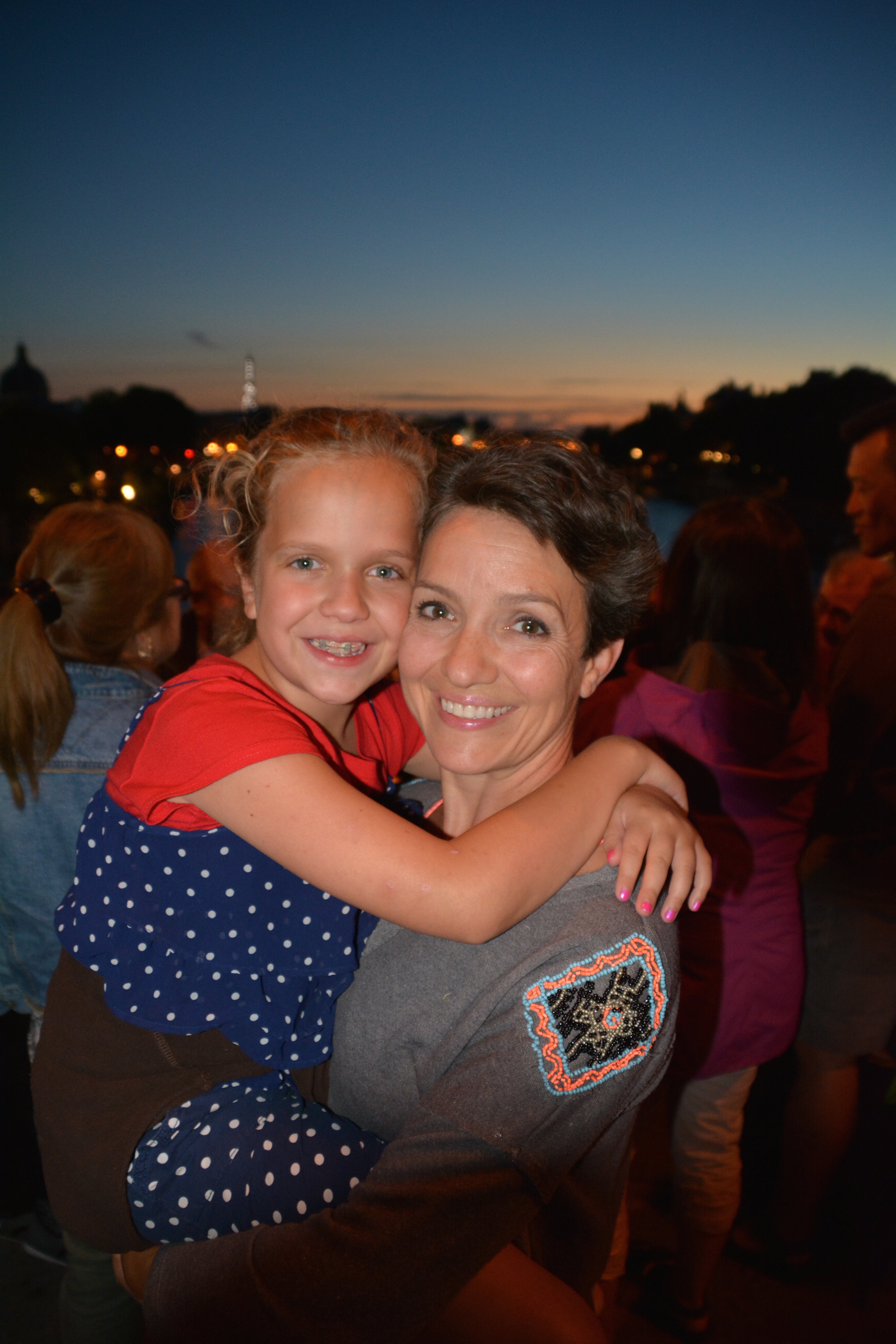Later in the day, after dinner and some rest back the apartment, the boys just weren’t UP for marching back through town to find a good viewing point for the fireworks. So LouAnn, Georgia, and I set out about 9:00 to get close but not too close. We found our perfect vantage point on the beautiful Pont Neuf. We talked and laughed as we waited for darkness to fully fall, watching the Seine dinner cruise boats pass underneath us and eavesdropping on the surrounding conversations. The fireworks were absolutely beautiful, a pure celebration. Vive la France!