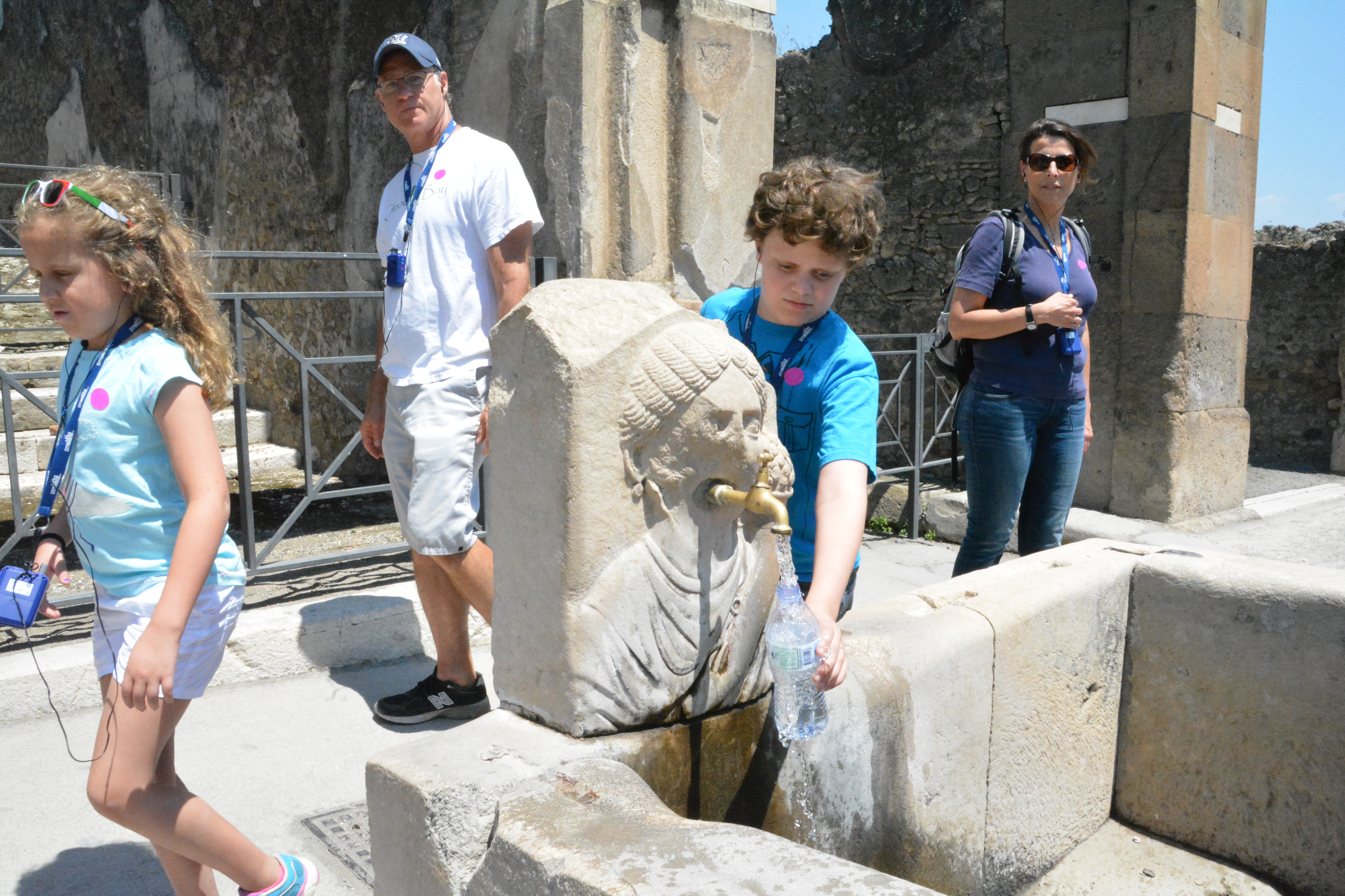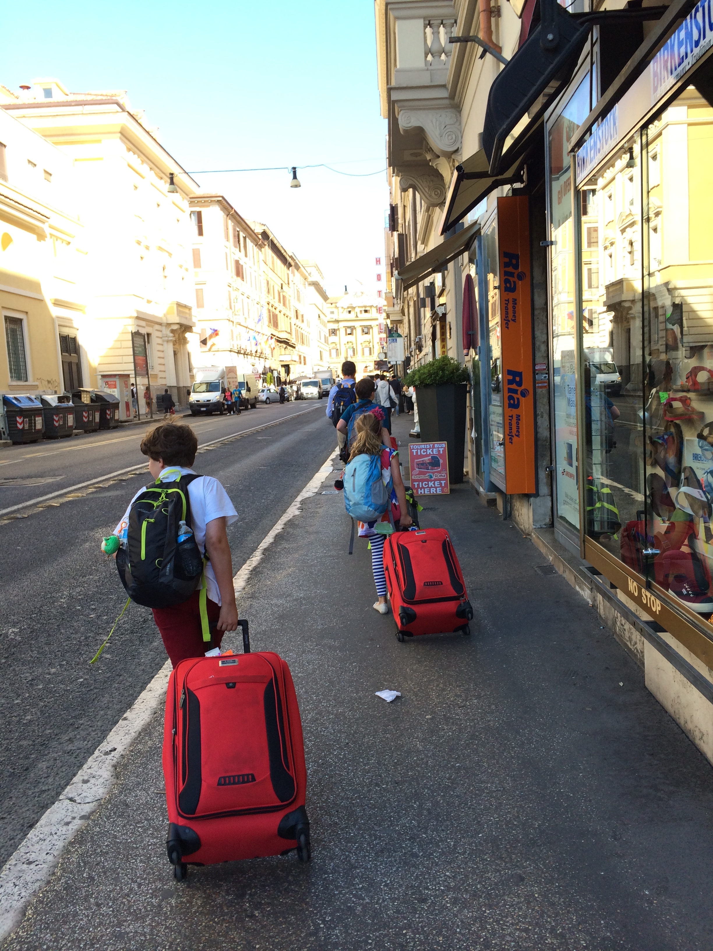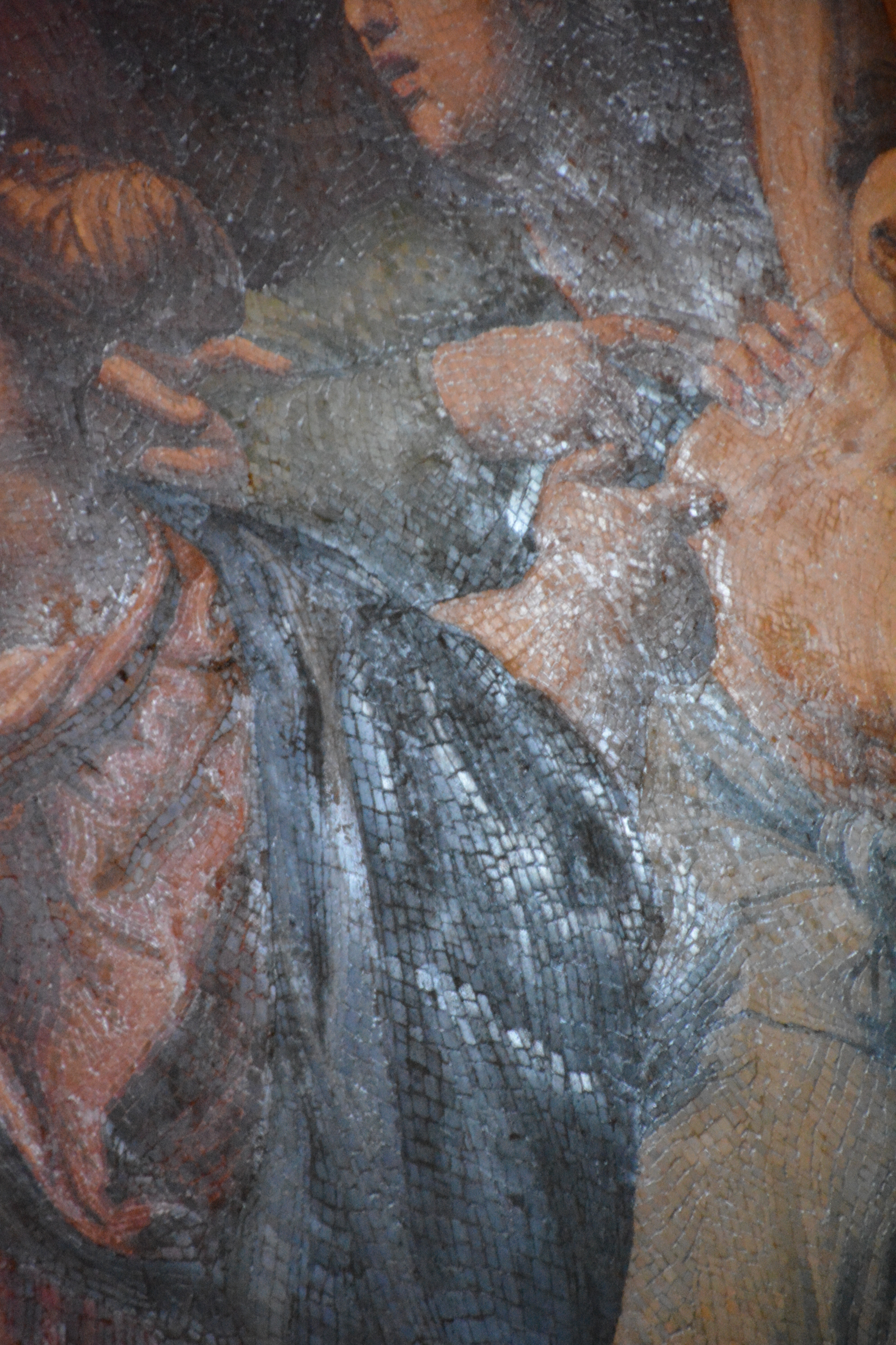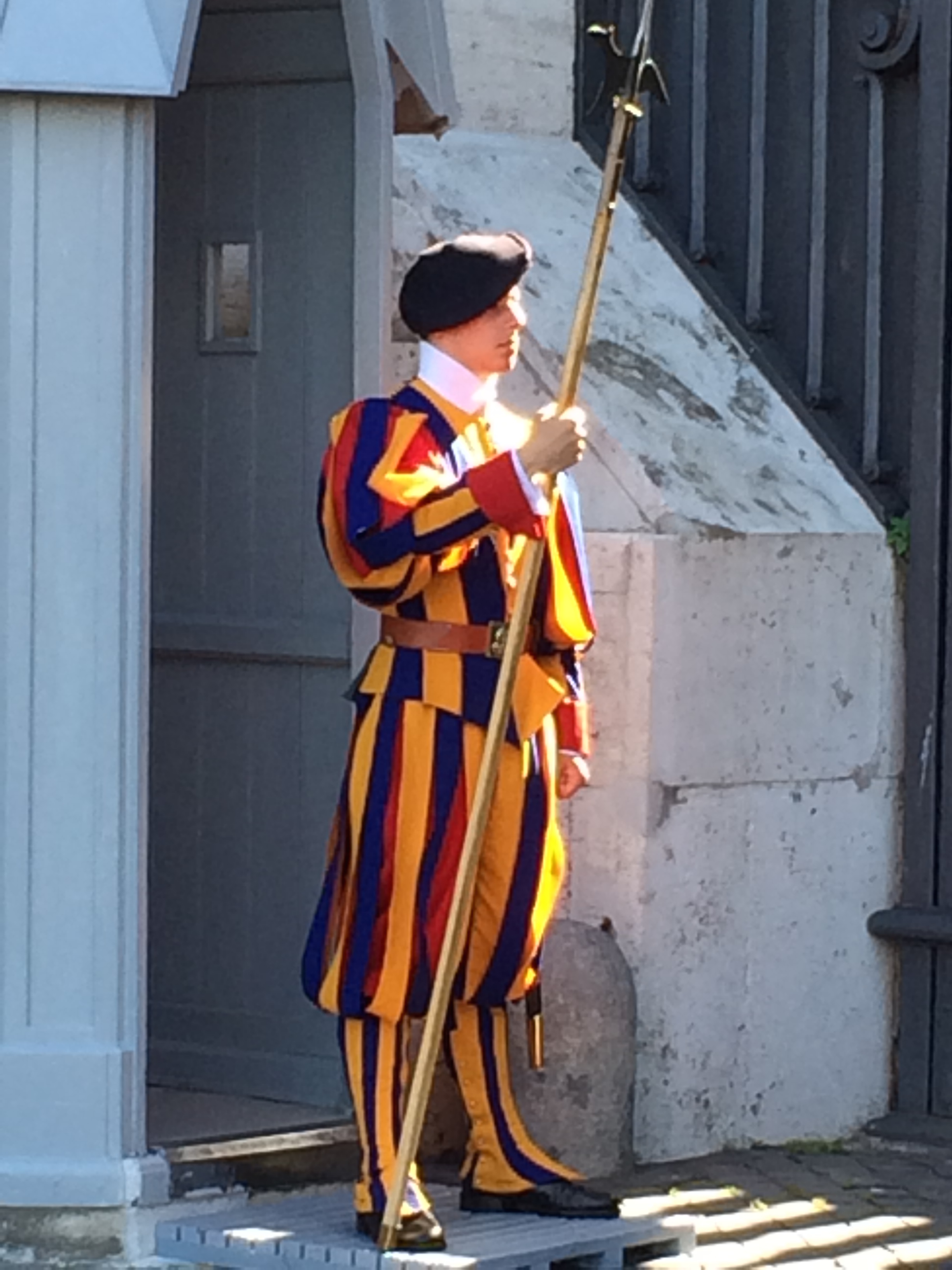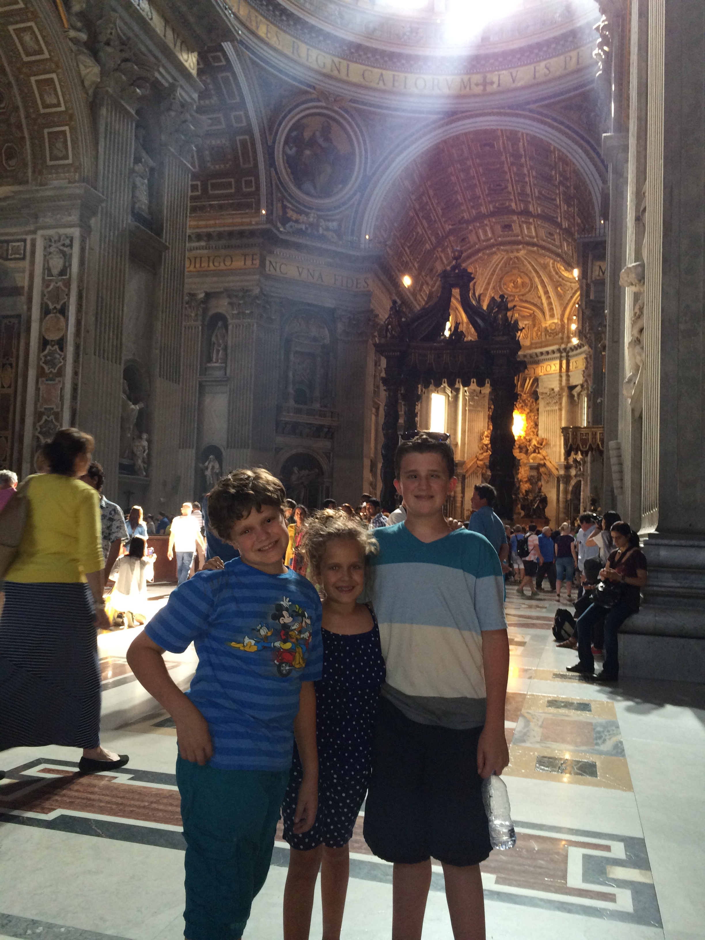 Fabio then took us over to St. Peter’s, which we didn’t think we’d see, as it had been closed that morning. (Did I mention that he skipped right past the 2-hour lines everywhere he took us?) As we entered, two rays of light were shining down into the central nave. Beautiful! We saw incredible paintings, mosaics, and sculptures, including Michelangelo’s “La Pieta.” Fabio pointed out that the enormous 15 ft. paintings were actually mosaics! You would never know unless you looked at it a certain way, with the light reflecting on it. Mind-blowing detail!